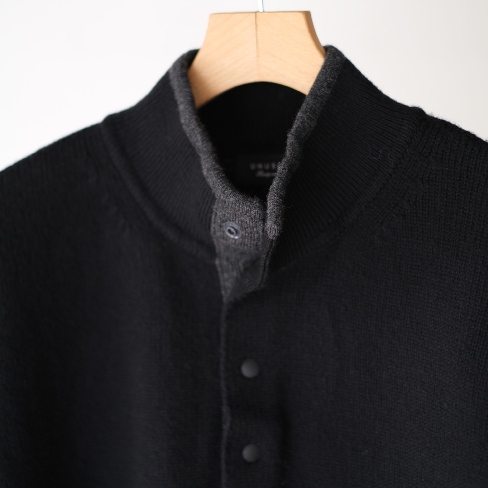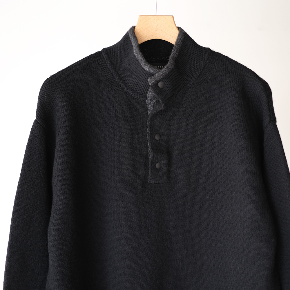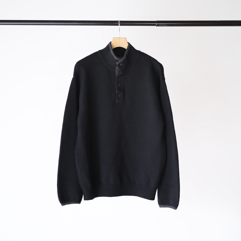 こちらは南フランス・アルル地方という標高1500~3000mの大自然の中で放牧飼育されたフランスメリノ種を原料として使用したニットで、通常のウールより非常に膨らみがあり、軽く保温性が特に優れています。 プルオーバーのボディー部分は3本撚りで編んでいますが、パイピングや前立て部分などは厚くならないよう2本撚りの糸で編み機のゲージも変え編立てられました。ミドルゲージではありますが、糸の膨らみと編み目を詰めた事で、ハイゲージのようなキレイな編み目に仕上げられています。
