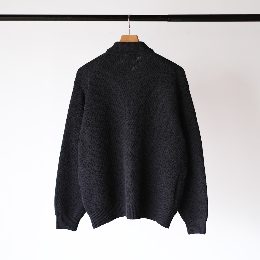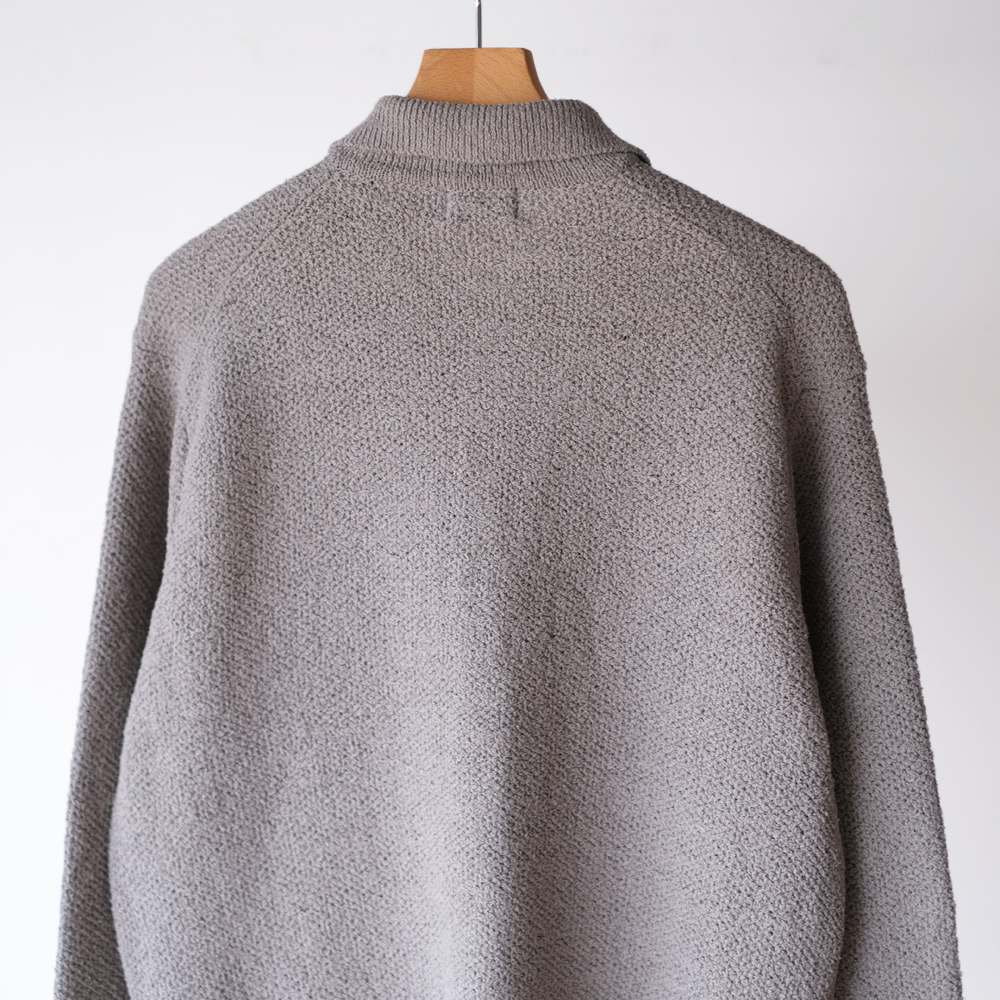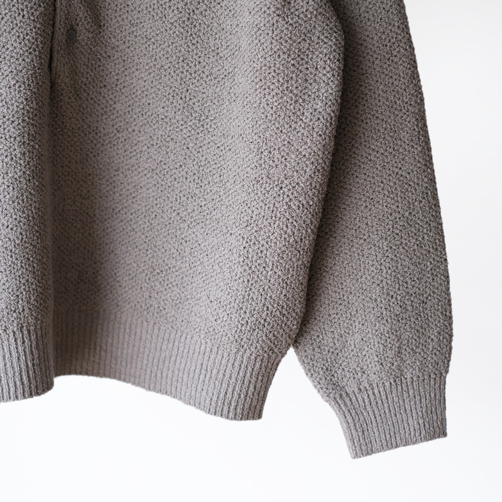 こちらは特殊撚糸によって軽さとドライタッチの綿糸をループ糸にした素材になります。 軽さとドライタッチ感を考慮して作製しているので、着用した際見た目ほどの重さは感じさせない軽量感となっております。 通常の自動編み機では編めない糸で、職人の手で動かす手横で、より凹凸感が出る「ハチ巣柄」で編んでいます。