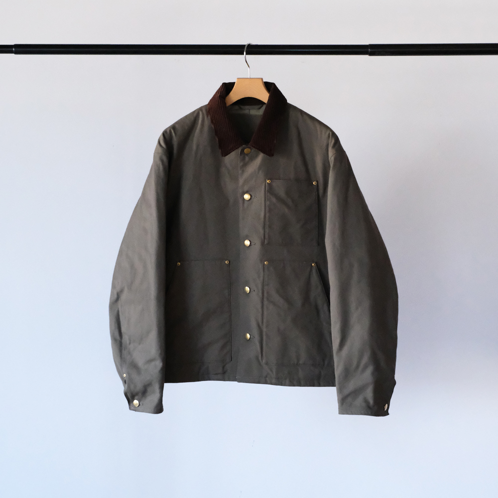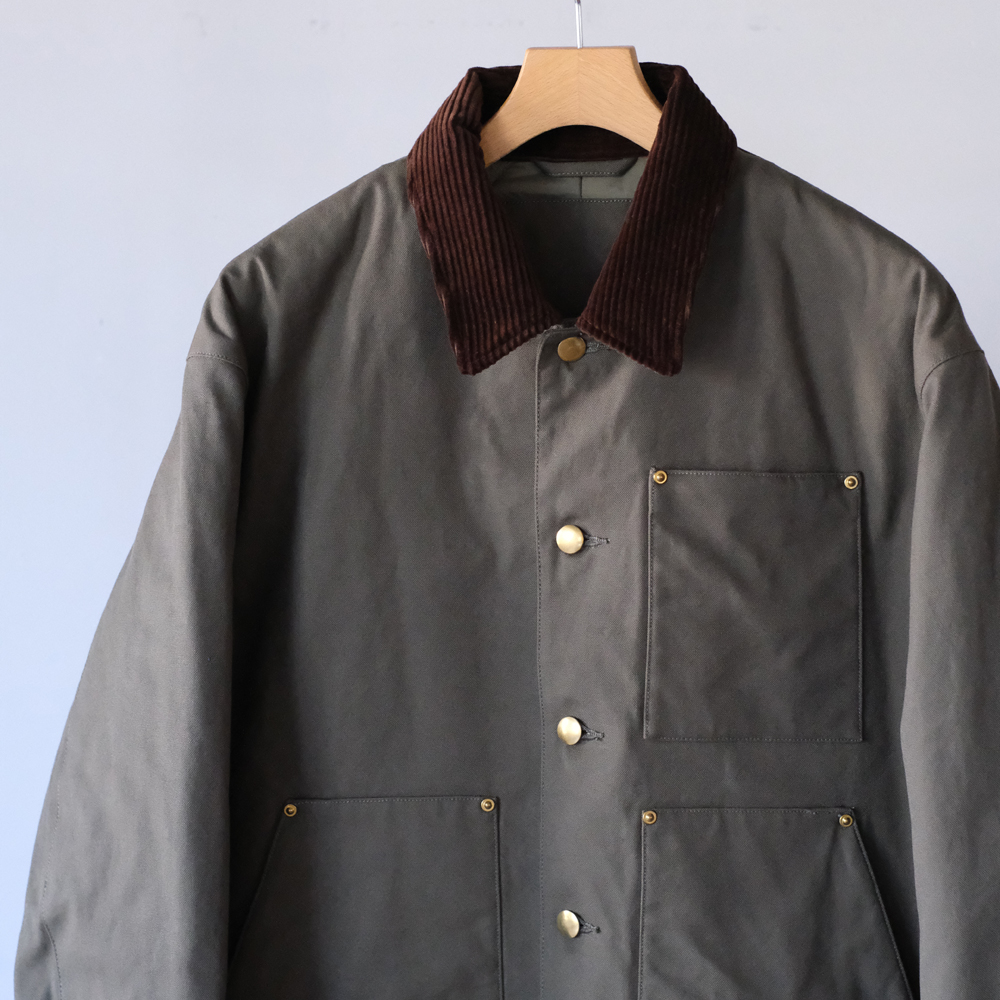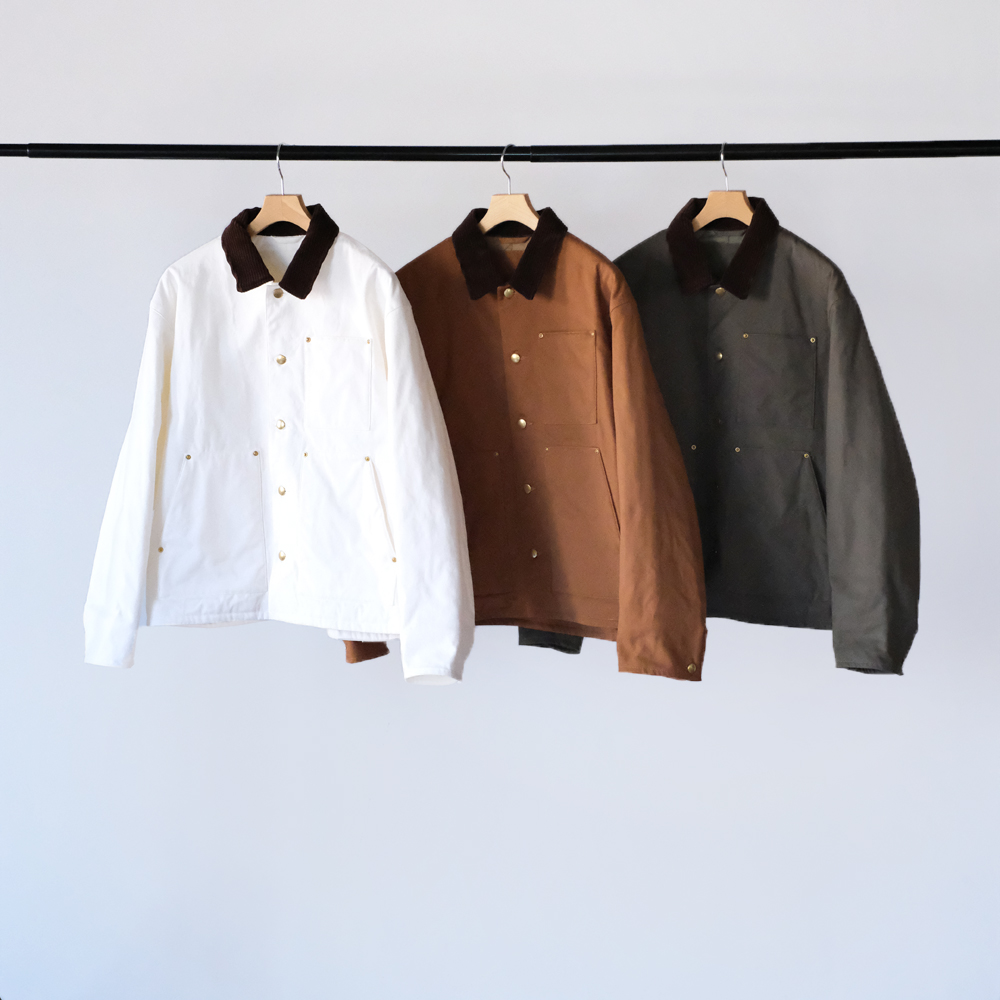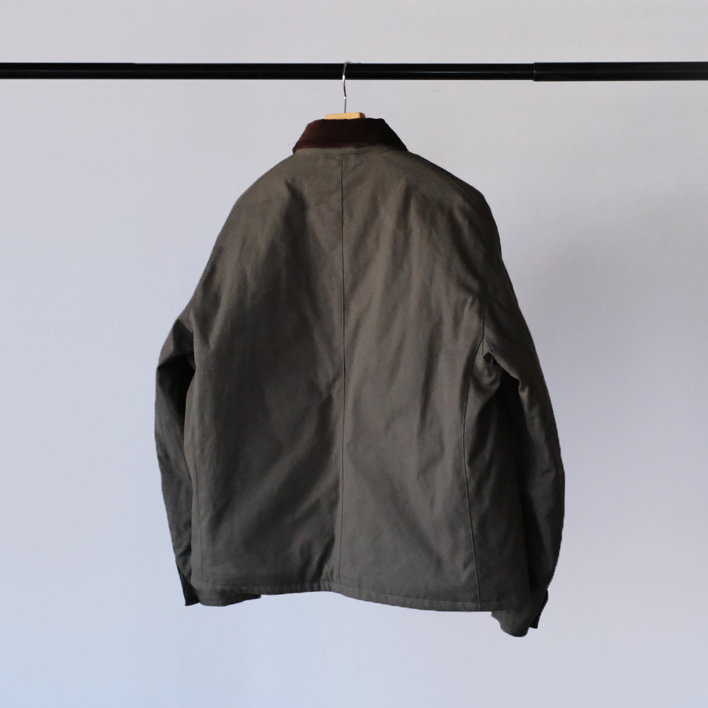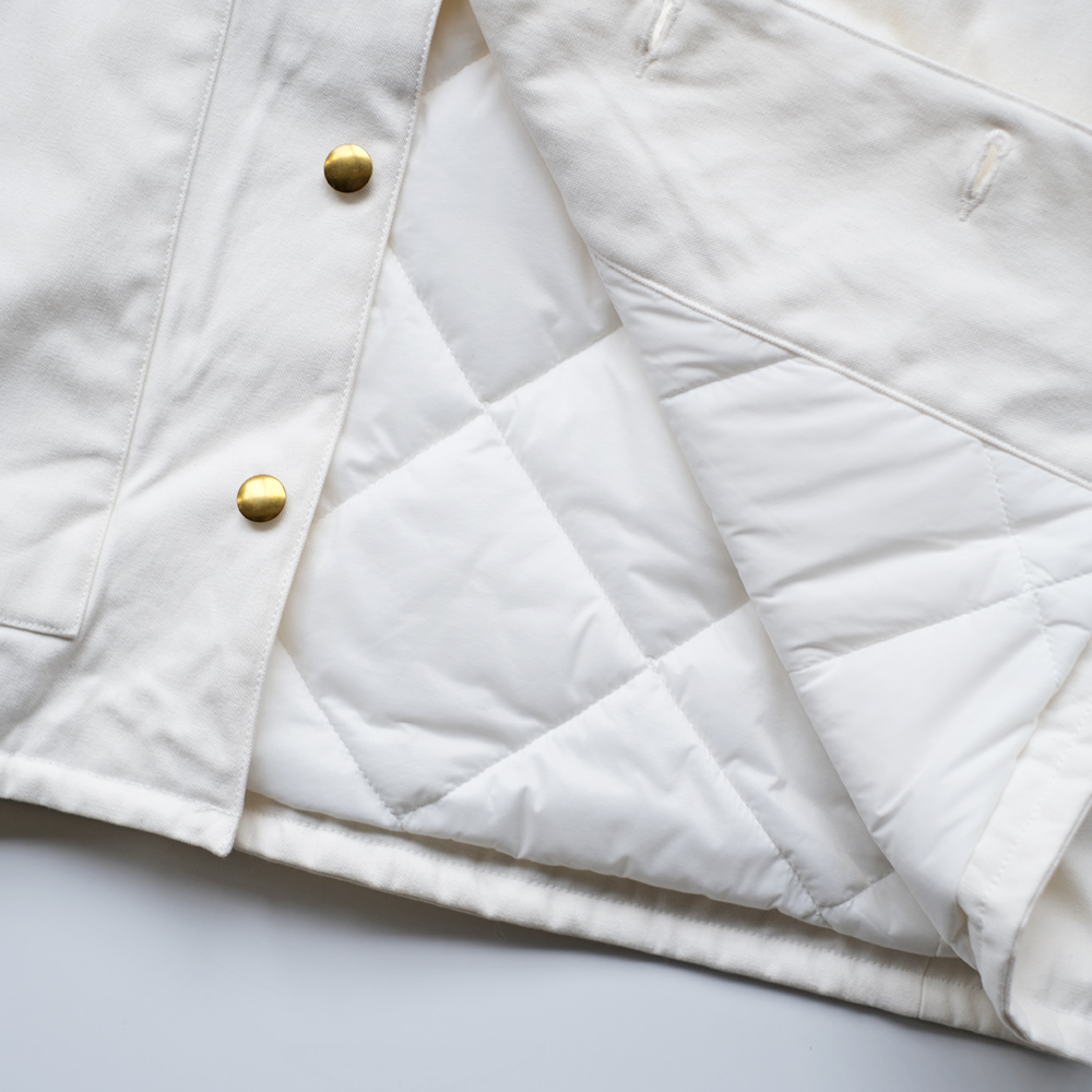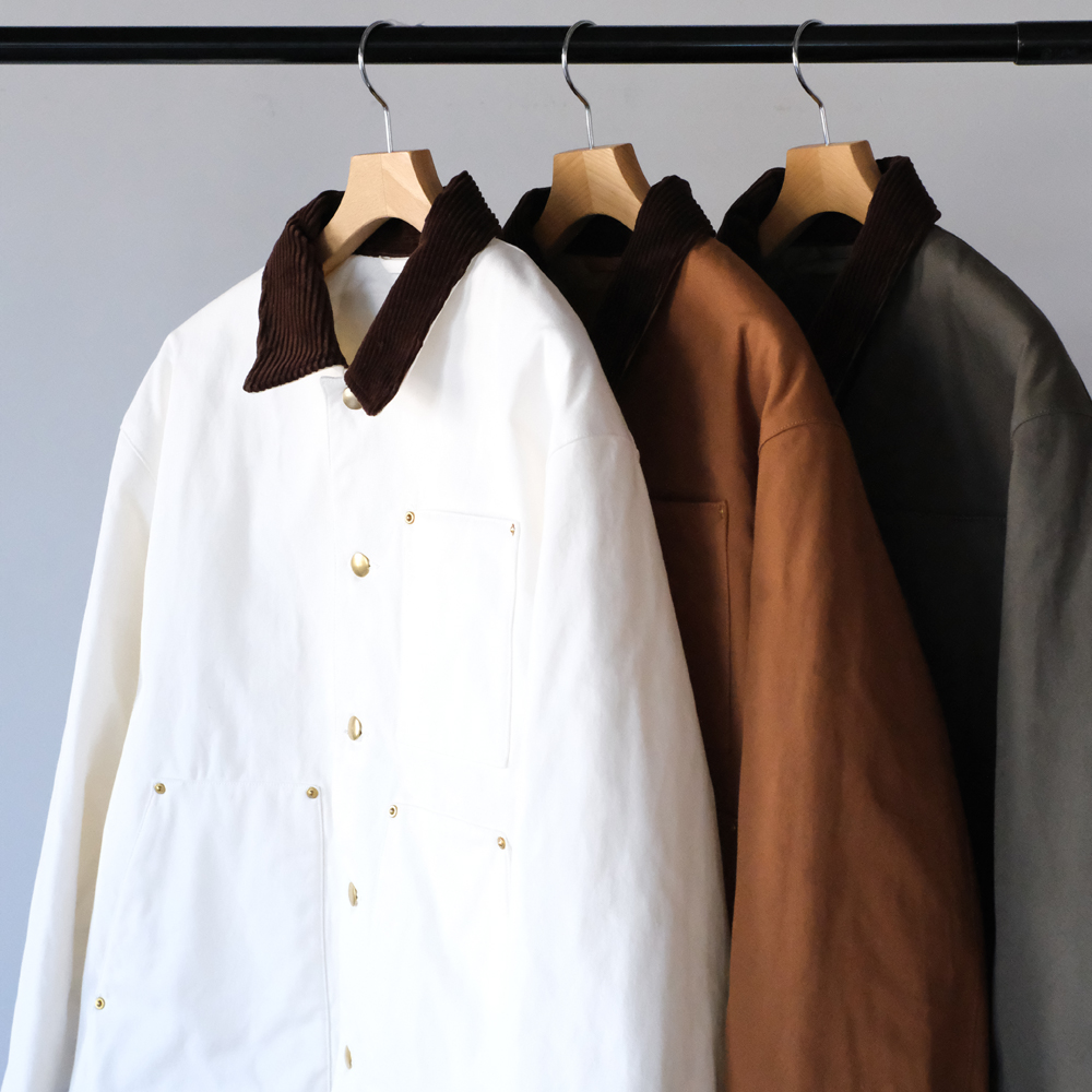 こちらは力織機を使用したセルヴィッチダックで、適度な打込みに加え膨らみある風合いを持ち合せた素材になります。裏地にはリサイクルナイロン糸を使用し、環境に配慮されてコーティング加工により防風性を高めた防寒アウター向けの軽量高密度素材を使用しています。特殊仮撚り糸を使用することによりシャリ感がありナチュラルなストレッチ表現しています。またコーデュロイはフラットでしっかりと締まった畝が、美しい表情を生み出します。