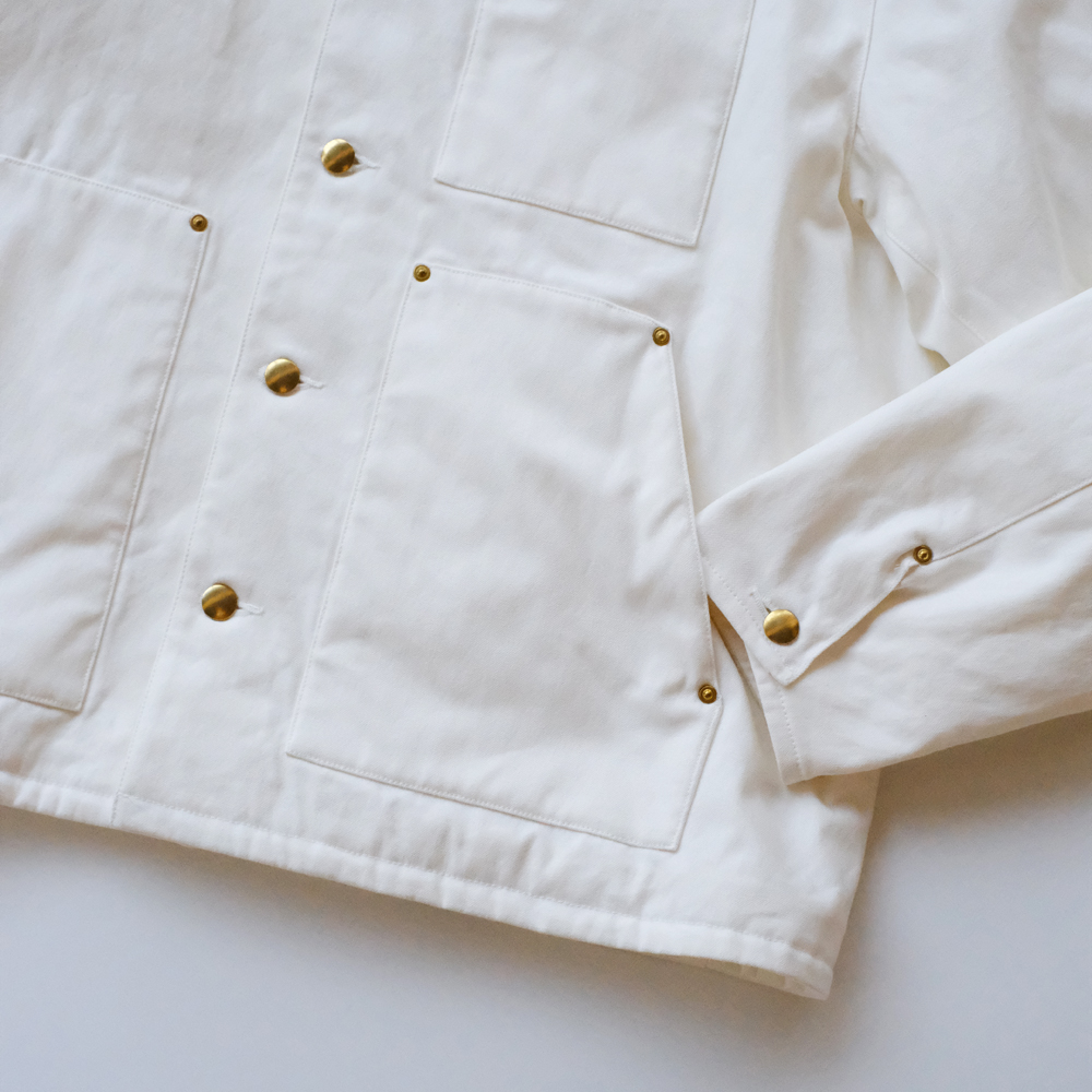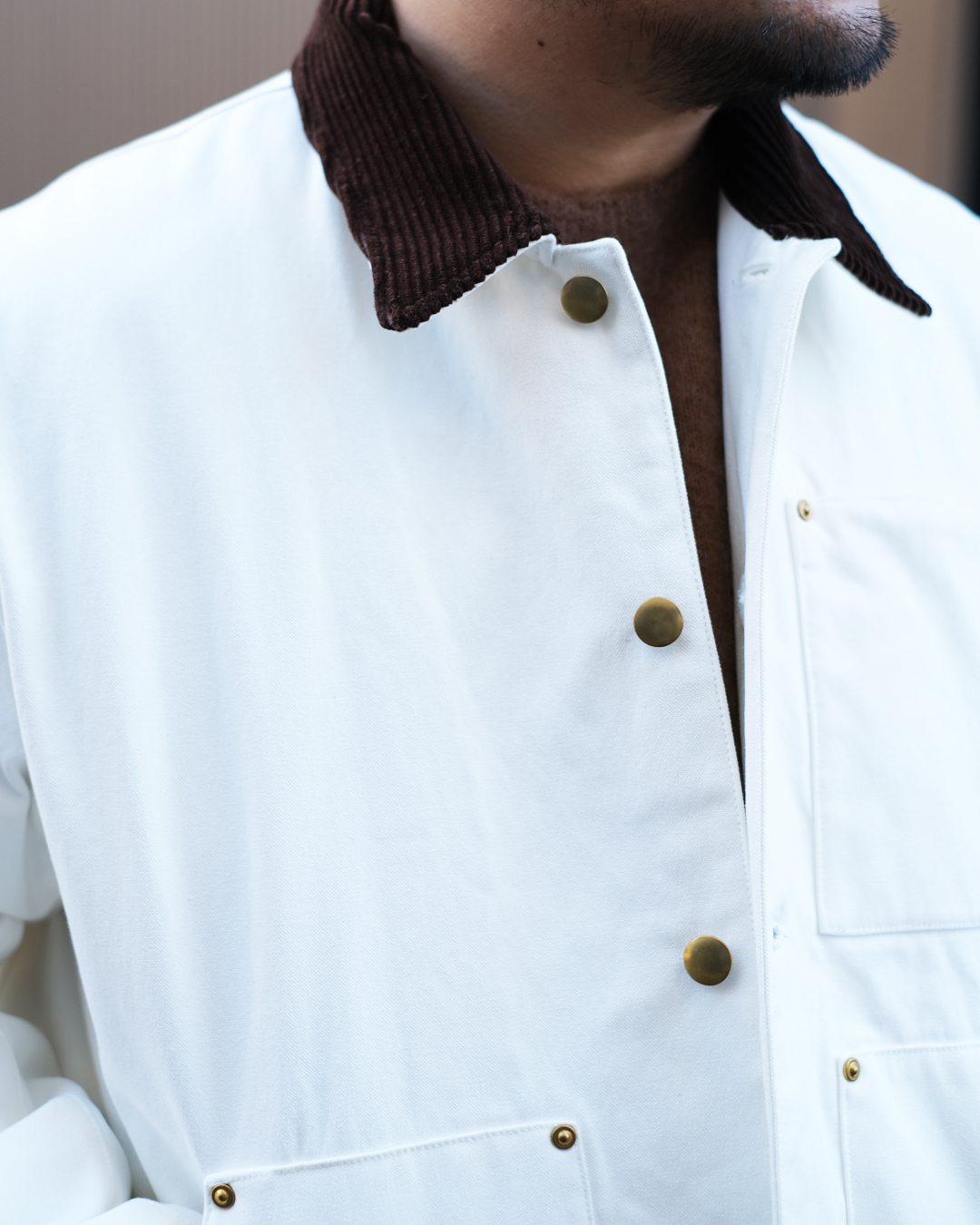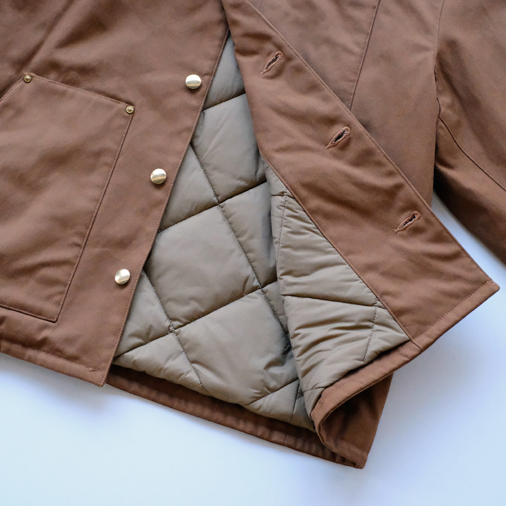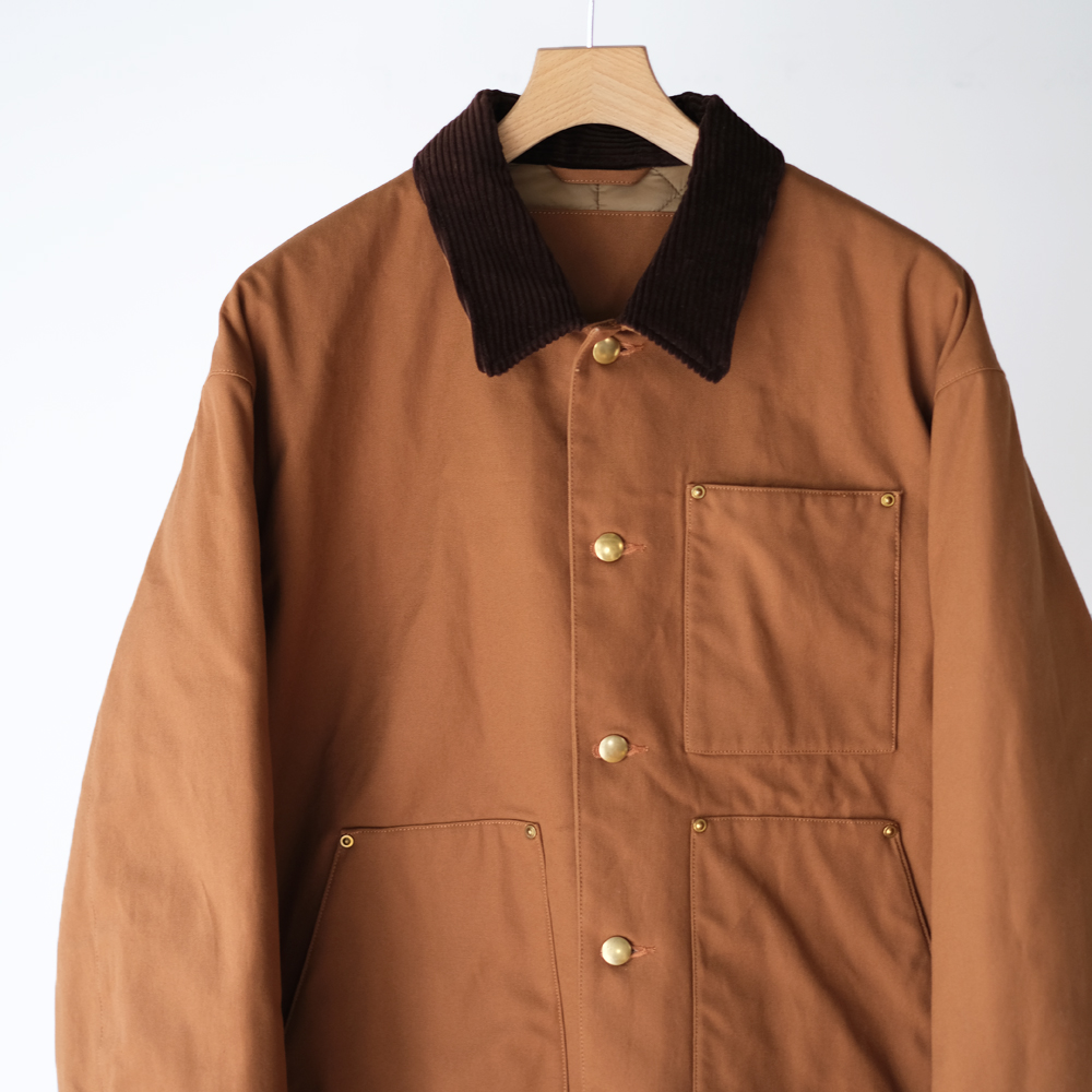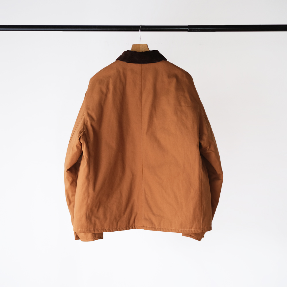 こちらは力織機を使用したセルヴィッチダックで、適度な打込みに加え膨らみある風合いを持ち合せた素材になります。裏地にはリサイクルナイロン糸を使用し、環境に配慮されてコーティング加工により防風性を高めた防寒アウター向けの軽量高密度素材を使用しています。特殊仮撚り糸を使用することによりシャリ感がありナチュラルなストレッチ表現しています。またコーデュロイはフラットでしっかりと締まった畝が、美しい表情を生み出します。