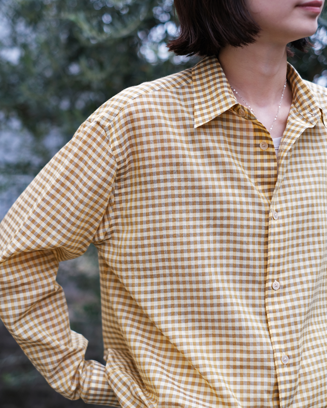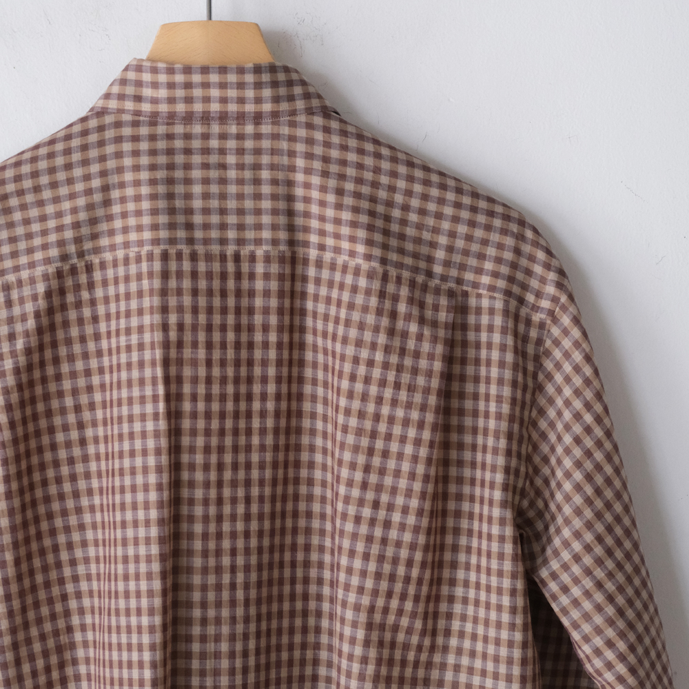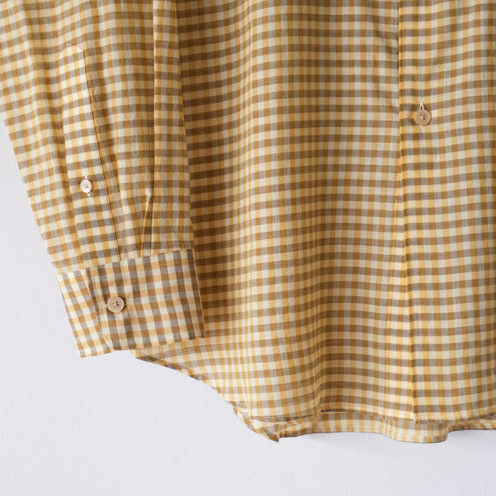 こちらは上質な細番手の超長綿を使用した、コットンギンガムチェック素材になります。極細番手の糸を丁寧に織り上げるため、1本1本に糊付けを施し、高密度に織り上げられています。また、深みのある色合いを表現するために、濃淡の異なる色に染め分けた糸を使用しています。上品な透け感と軽やかな風合いを備えた、繊細で美しい素材が魅力の一着となっております。