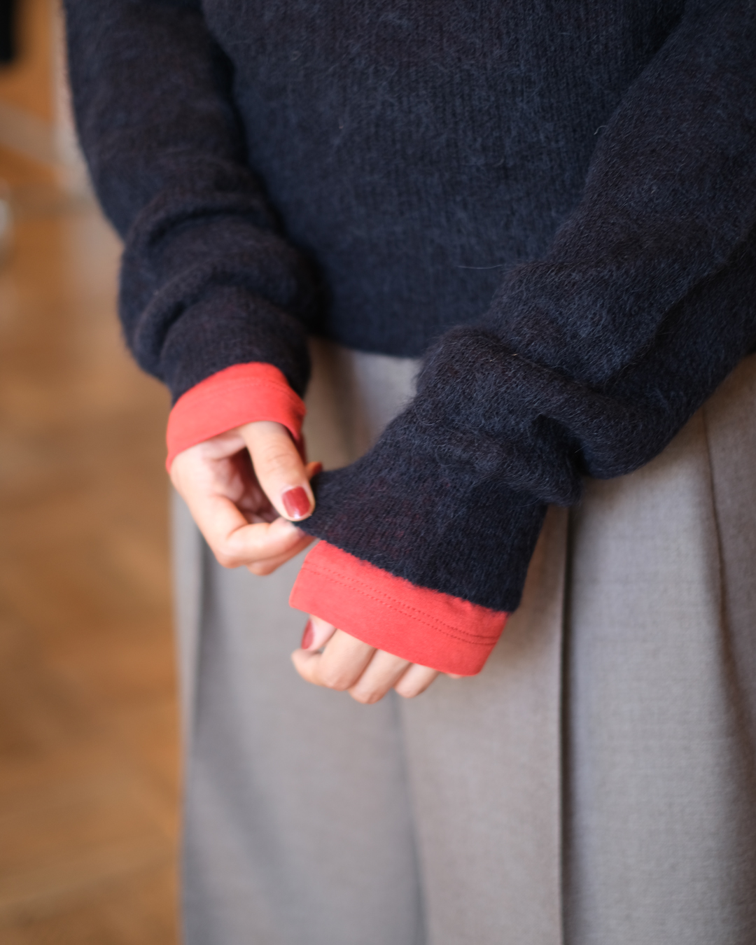 こちらは希少な原料であるベビースーリーアルパカのタムヤーンを使用したニットになります。繊細な毛足を引き立てるため、時間をかけて丁寧に仕上げられ、極上の滑らかさと柔らかさを兼ね備えた素材感が魅力のアイテムです。