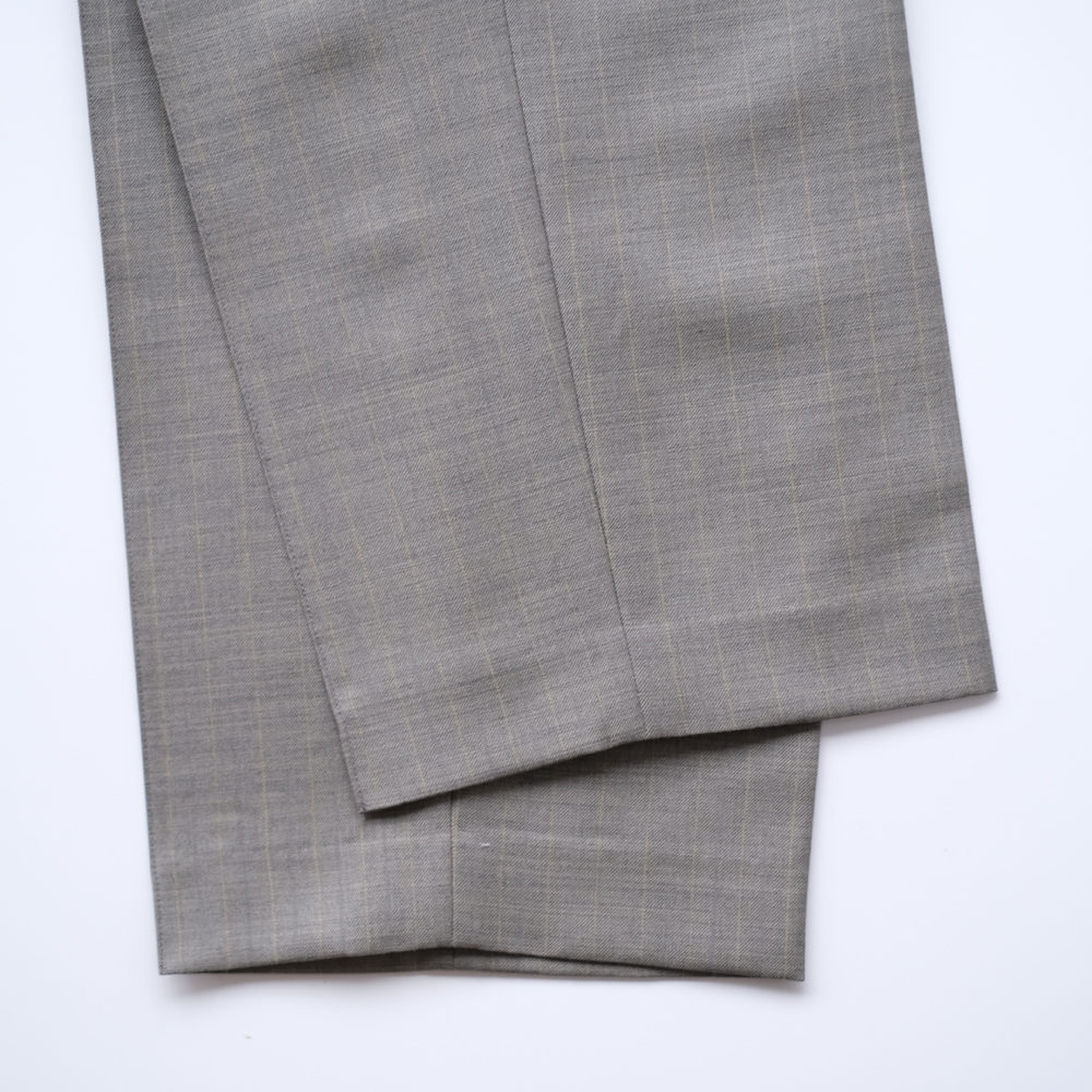 こちらは経糸にはスーパー130’sのスーパーエキストラファインメリノを、緯糸には英国羊毛ブルーフェイスラスター種の梳毛糸を使用した贅沢な素材となります。ブルーフェイス特有のふくらみと程よい反発性に、スーパーエキストラファインメリノの極上の滑らかさを組み合わせることで、豊かな質感と肌触りを実現しています。高級感あふれるなめらかさと弾力性を兼ね備えた、奥行きのある風合いが魅力の一着です。