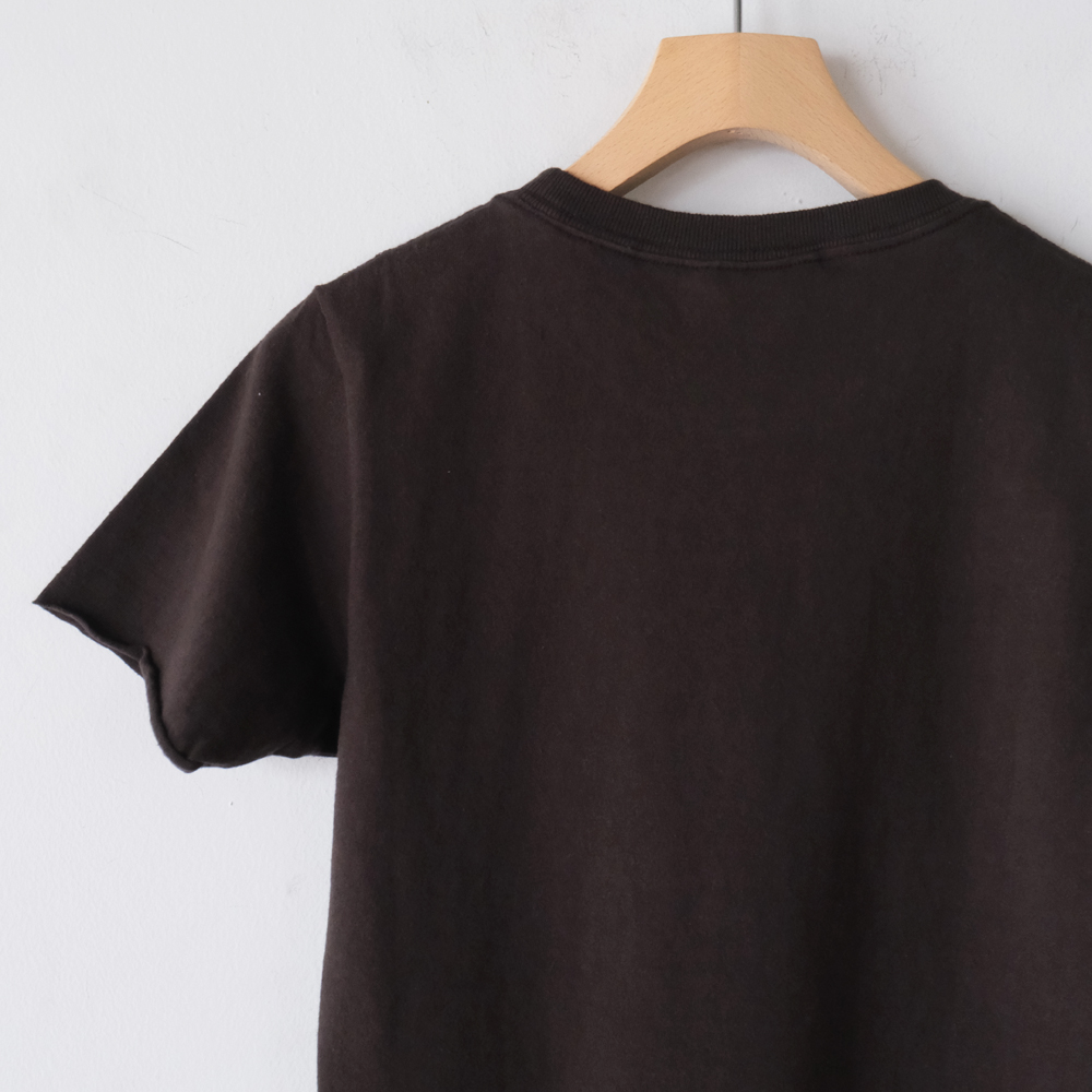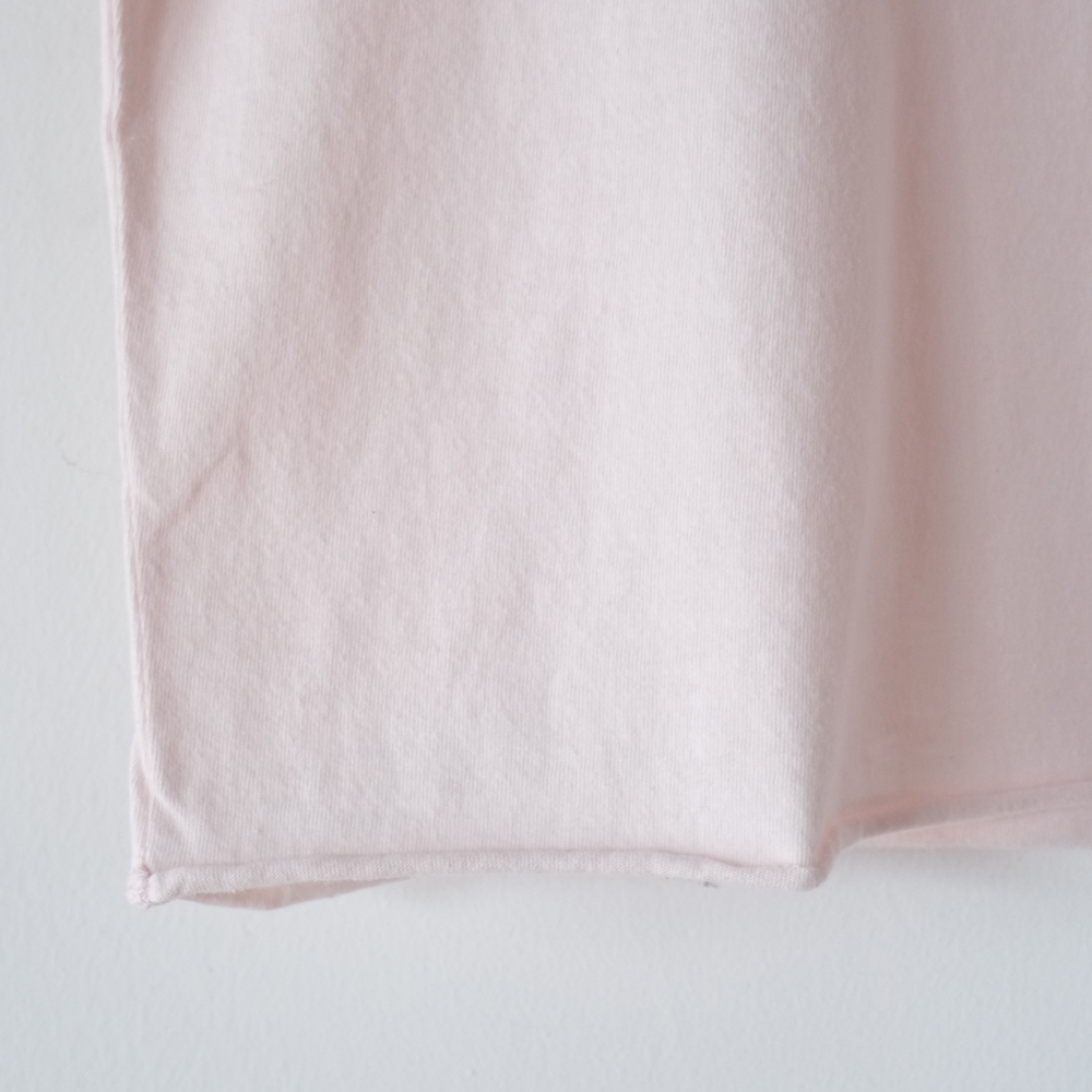 こちらはオーガニックコットン糸に紡績工程で空気を当てて微細な起毛を施すことで、糸全体がふんわりと柔らかく、しっとりと滑らかな風合いに仕上がっています。起毛感のあるヴィンテージライクな表情ながらも、軽やかでなめらかなタッチが特徴の一着です。