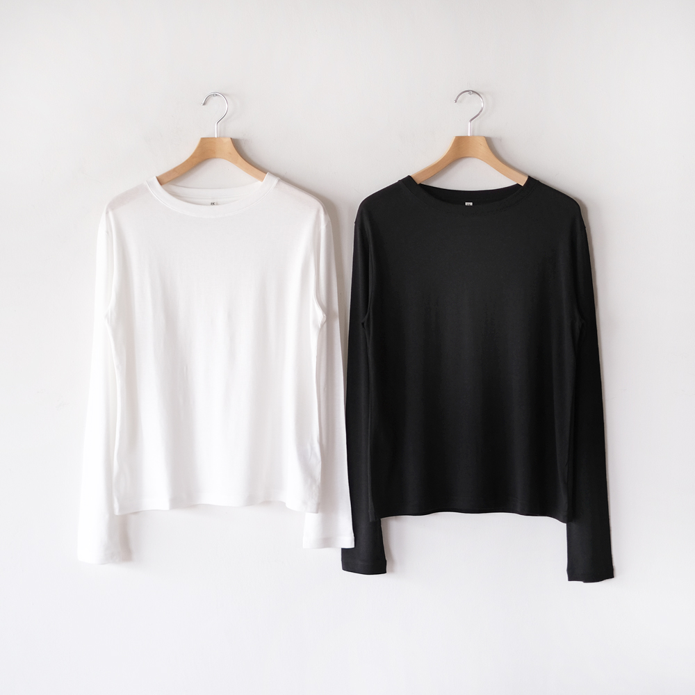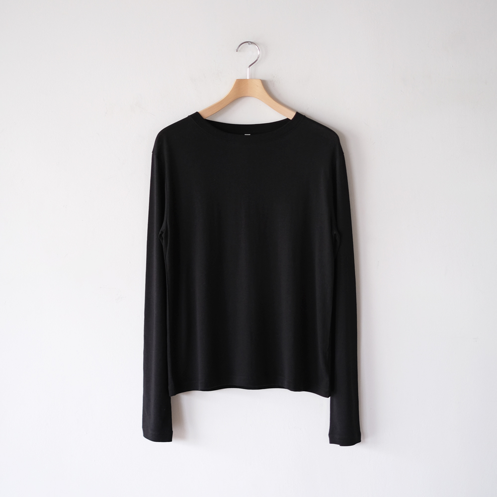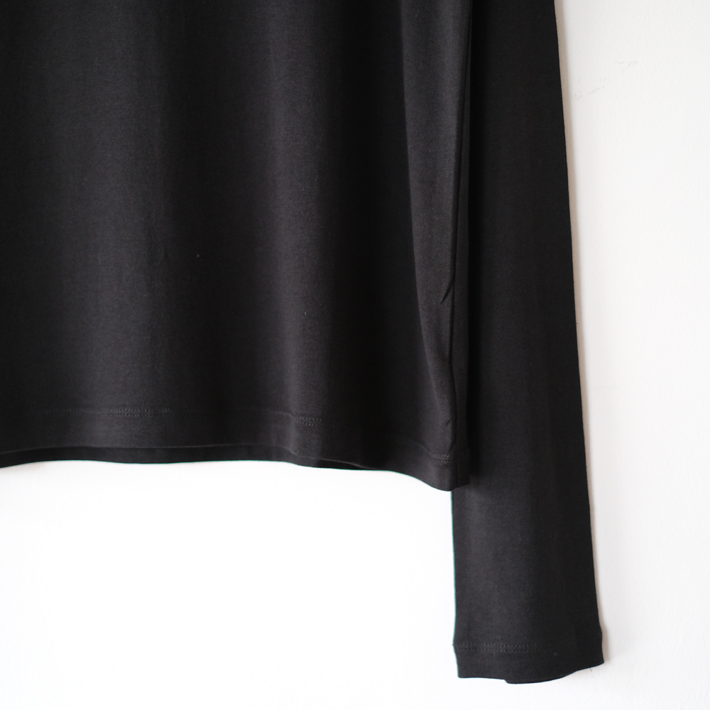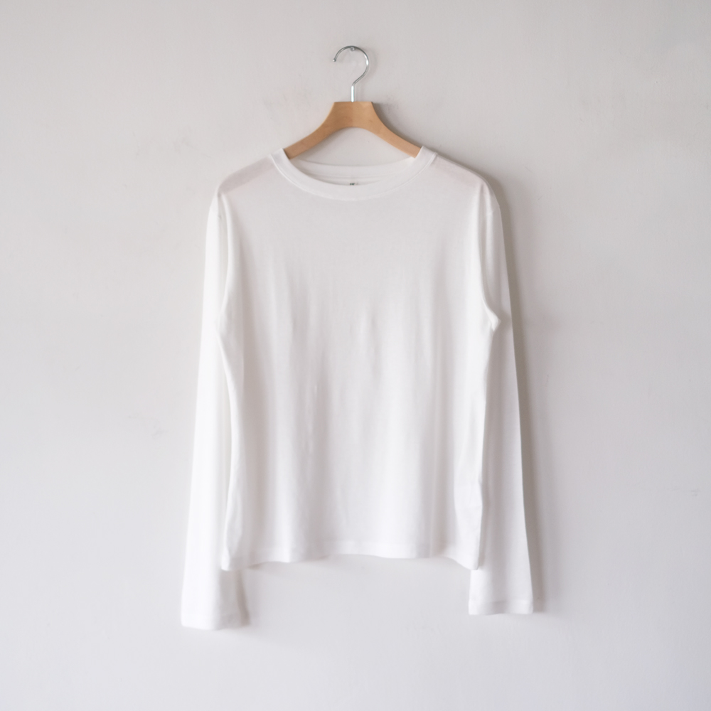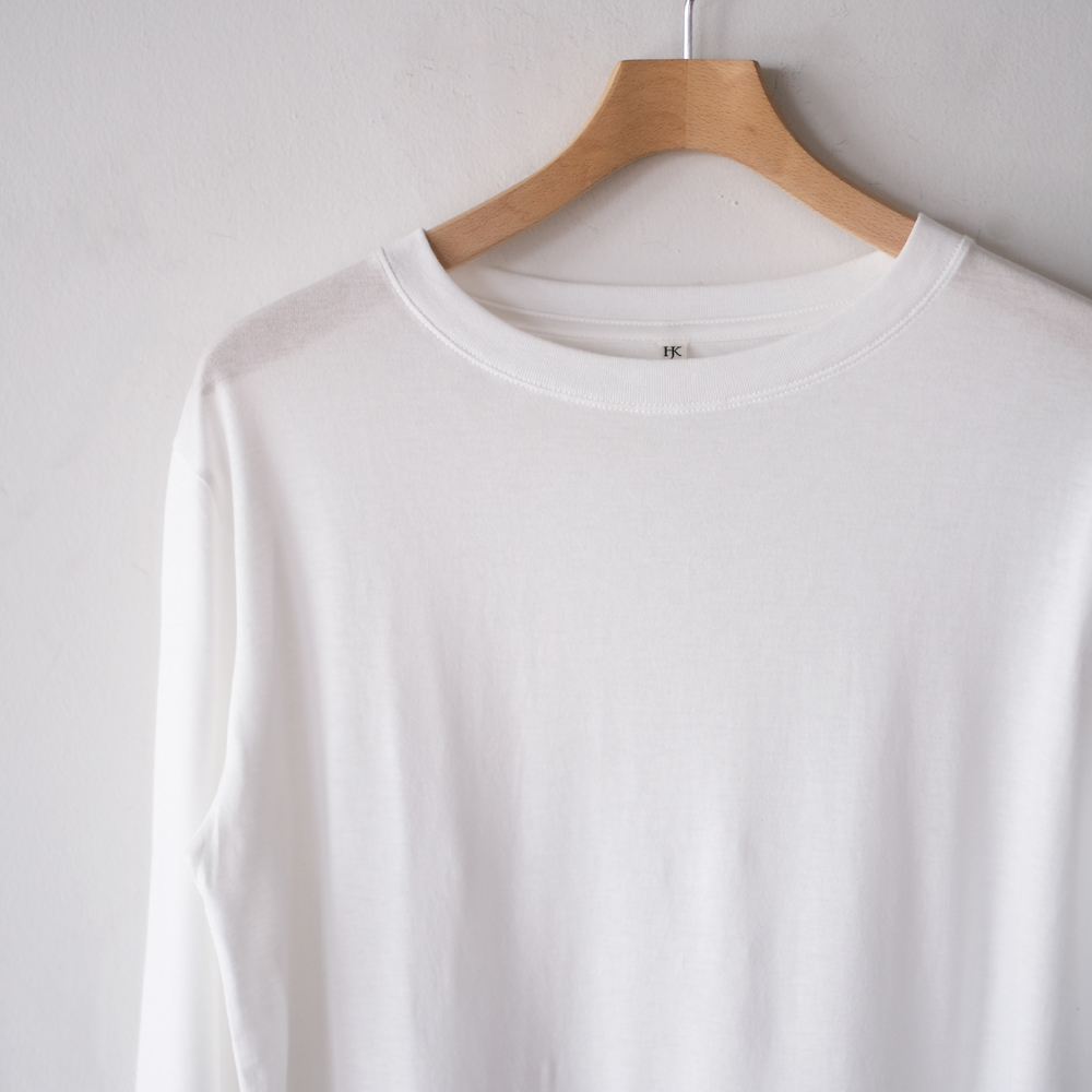 こちらはセルロースコットン糸で編み上げたオリジナル天竺生地を使用した定番長袖Tシャツです。襟のフロントは跨ぎ二本針でフラットに、襟後ろはタコバインダーで細部まで美しい仕様になっています。細二本針縫製で仕上げたカジュアルな中でも繊細な印象を目指した一着となっています。