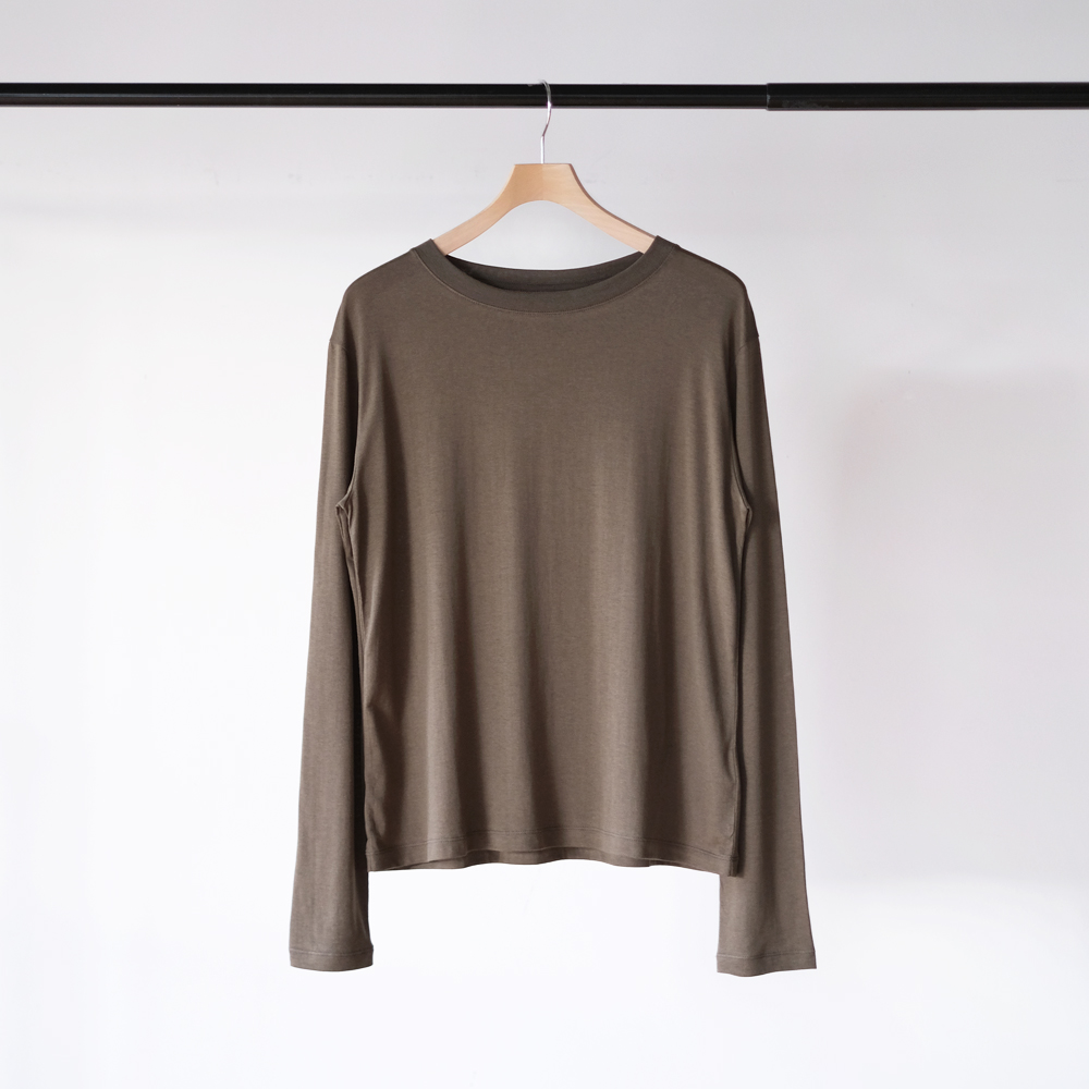 こちらはセルロースコットン糸で編み上げたオリジナル天竺生地を使用した定番長袖Tシャツです。襟のフロントは跨ぎ二本針でフラットに、襟後ろはタコバインダーで細部まで美しい仕様になっています。細二本針縫製で仕上げたカジュアルな中でも繊細な印象を目指した一着となっています。