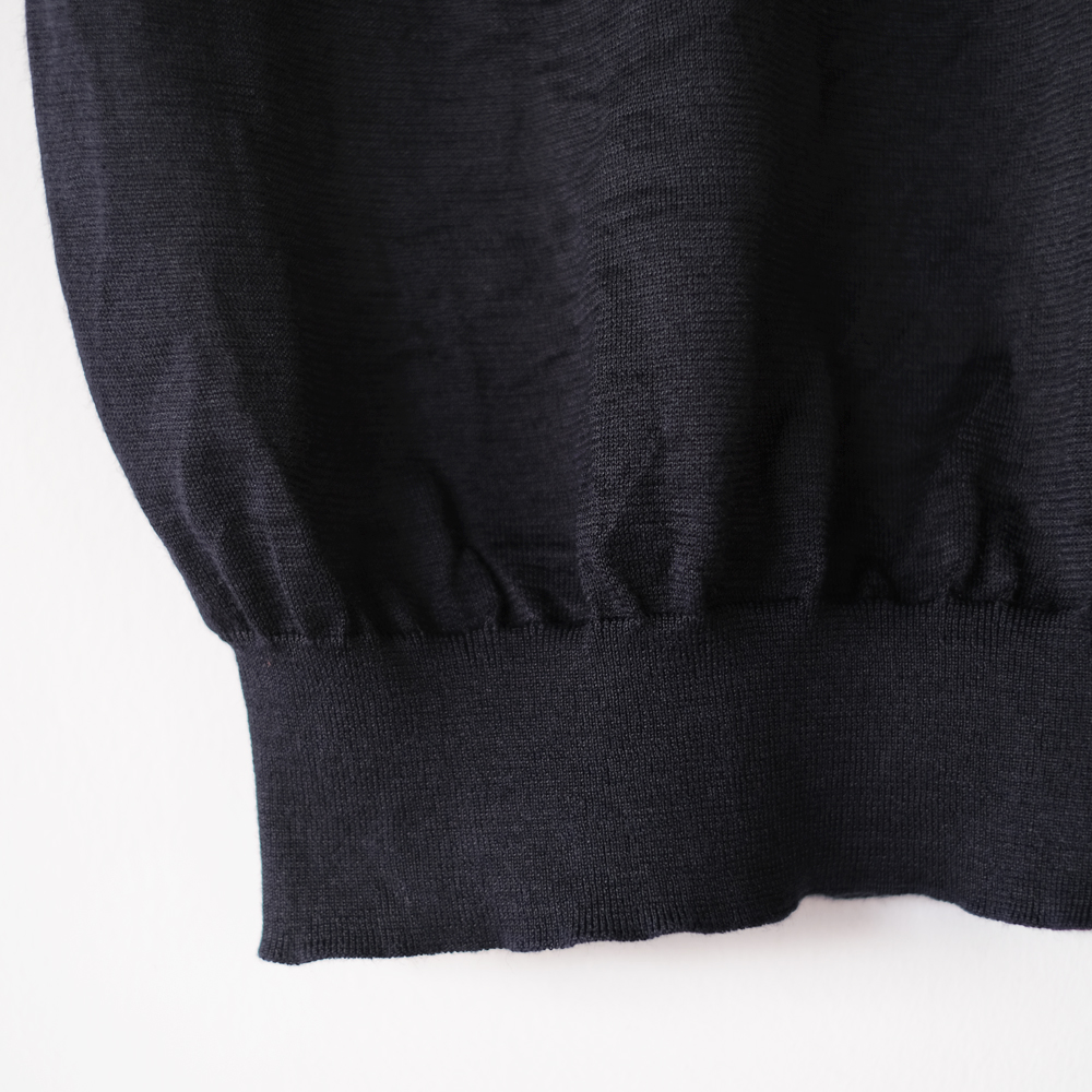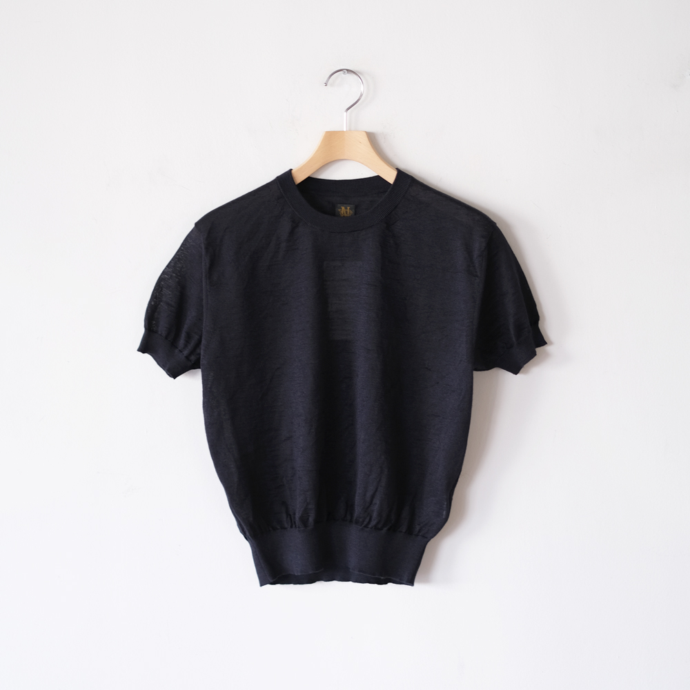 こちらは光沢感と清涼感が特徴のロイヤルラミーを極細番手に紡績した繊細な糸を使用しております。ハイゲージの編機でゆっくりと編み立てており、ラミー特有のハリコシと透け感、凹凸やシボ感が感じられる表情豊かで肌離れの良い商品となっています。