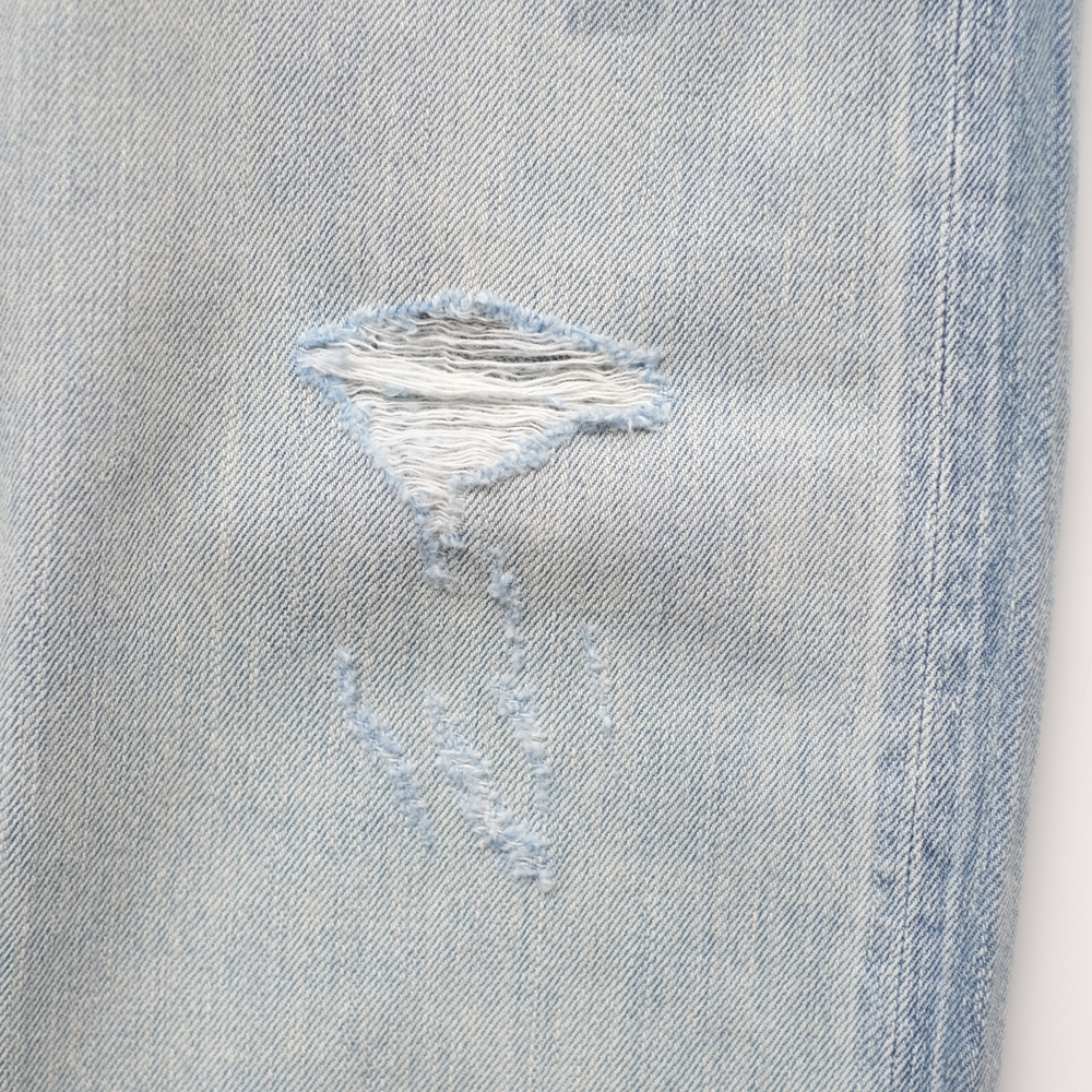 こちらはタテ糸にロープ染色した短繊維のネップ糸、ヨコ糸に上質なスビンコットンを使用し、シャトル織機で時間をかけて丁寧に織り上げたデニムになります。タテ糸にあえて短繊維を用いることで生まれる毛羽感と、ふっくらとしたヴィンテージ調の表情に、ヨコ糸の美しい長繊維がもたらす上品な膨らみと柔らかさが絶妙に調和しています。一着ずつ手作業で色を落とし、ダメージ加工を施した、熟練の職人技が光る特別なアイテムです。
