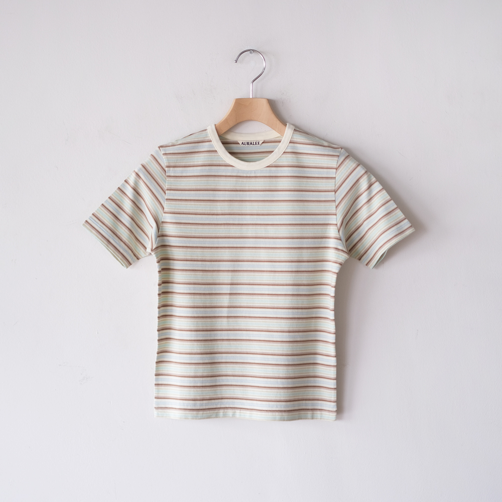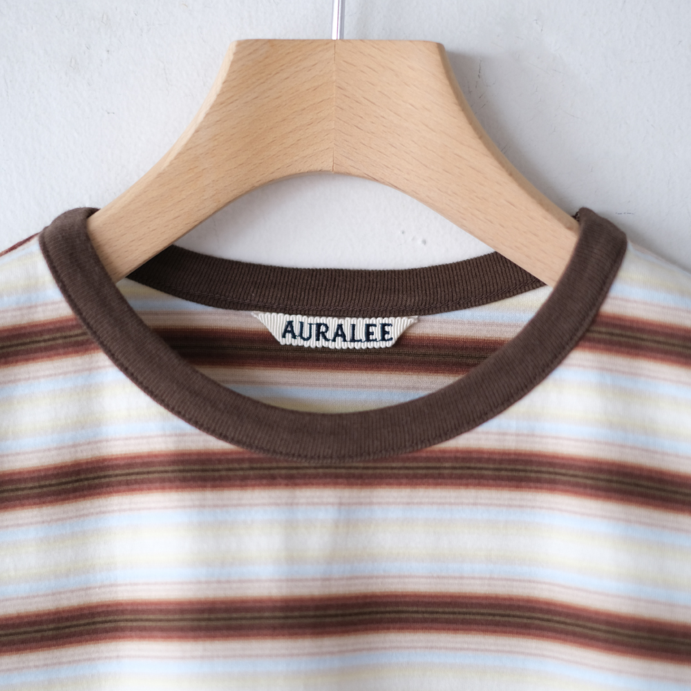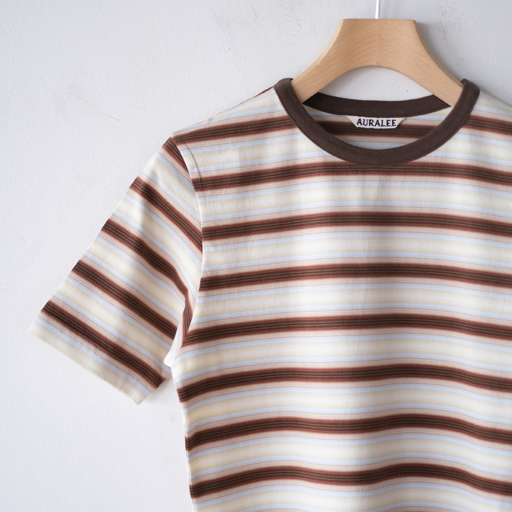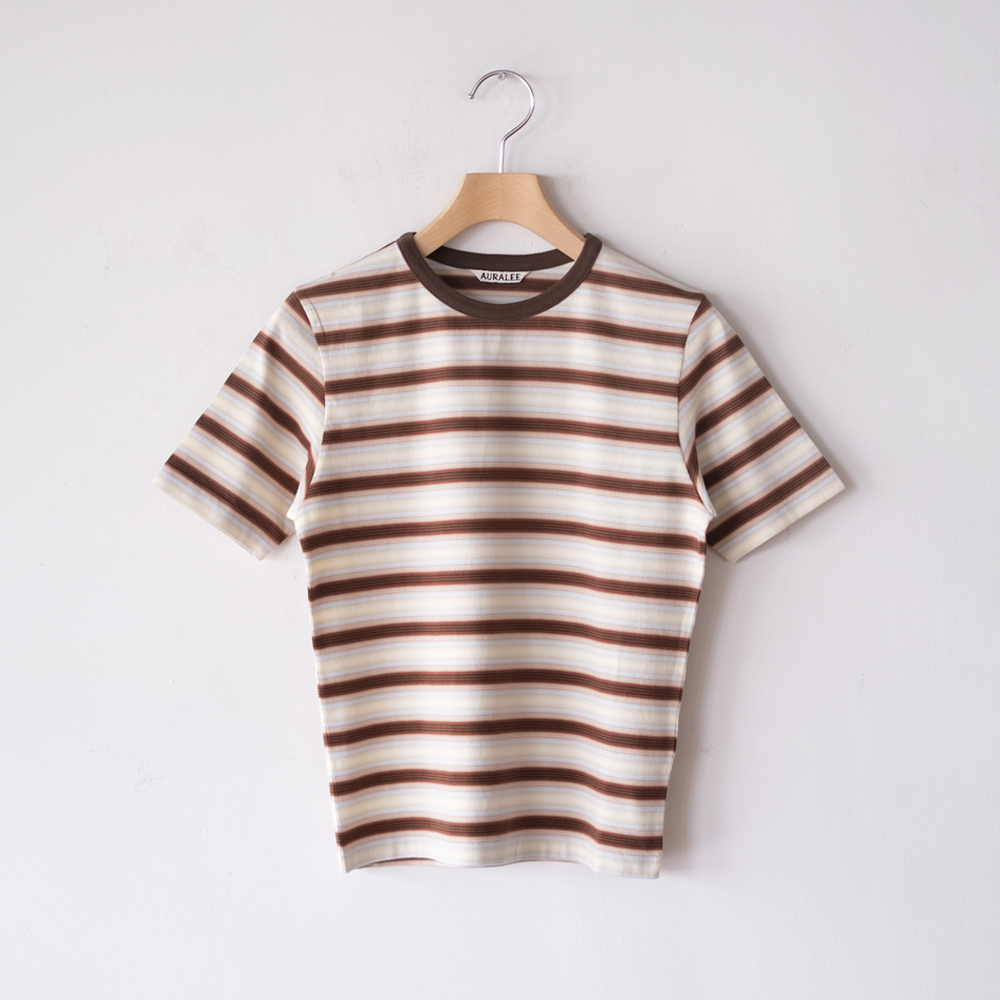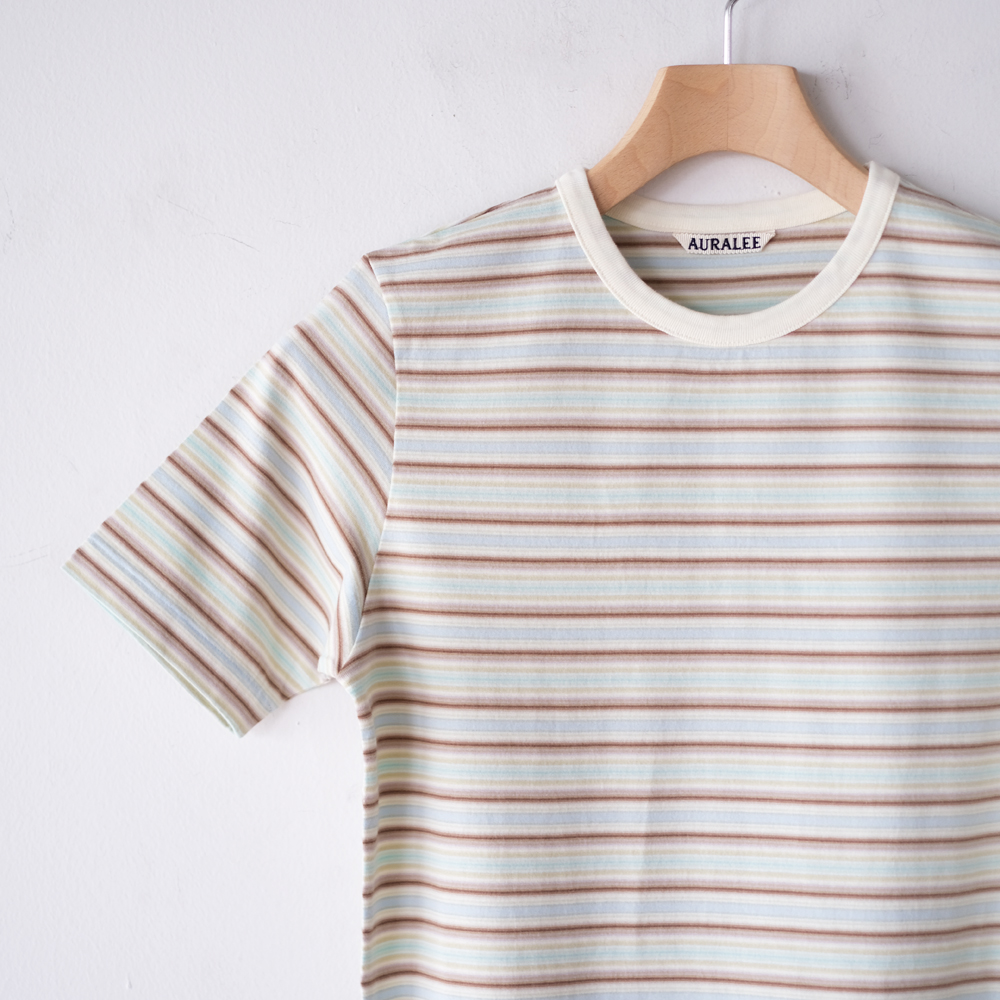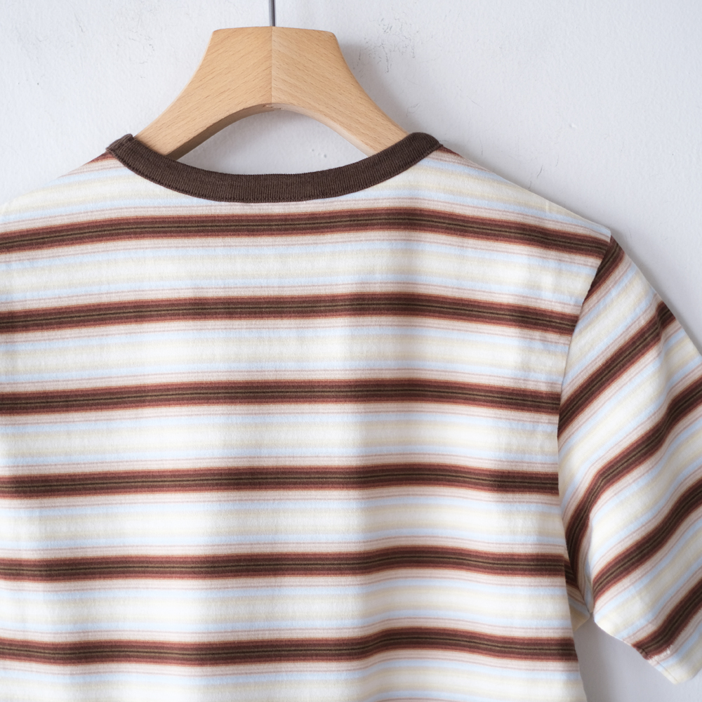 こちらはハイゲージの編み機を使用し、23色もの糸を巧みに組み合わせて編み上げたグラデーションボーダーの天竺素材になります。繊細な色の重なりが生み出す、奥行きのある美しい色彩が魅力の一着です。