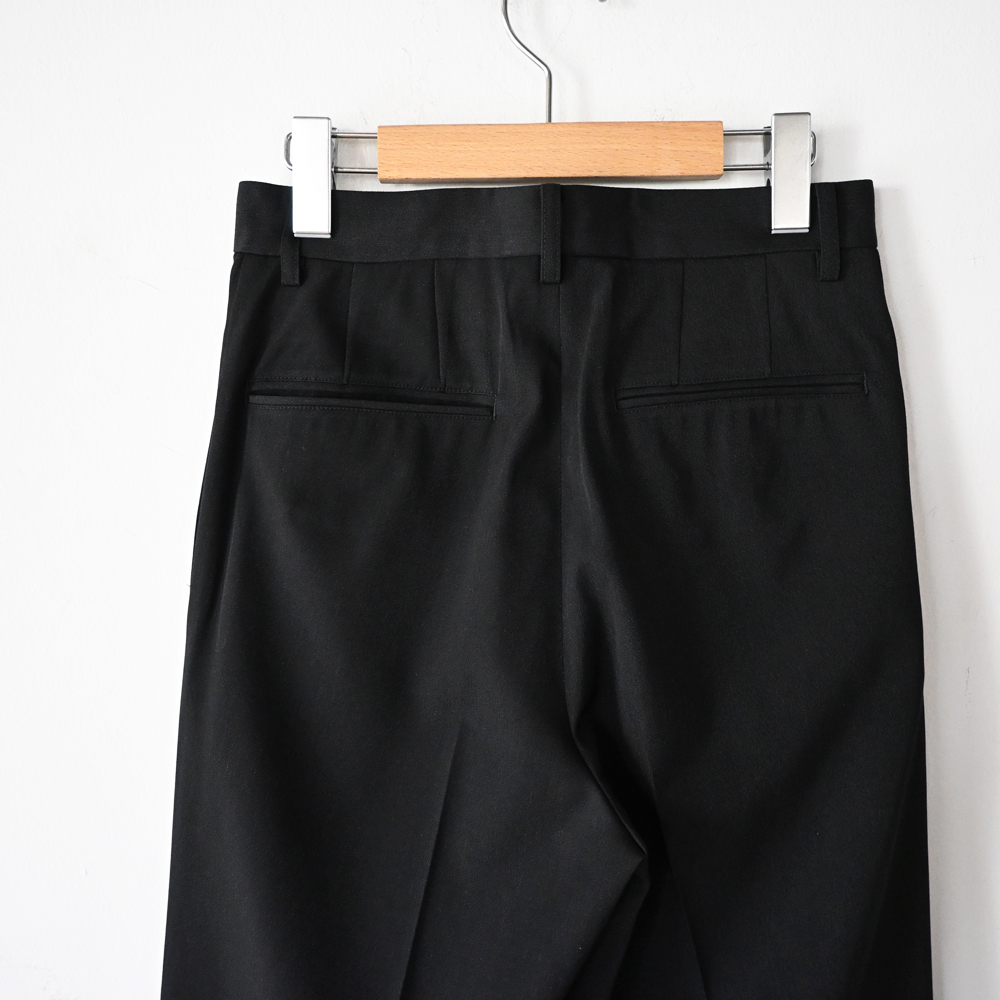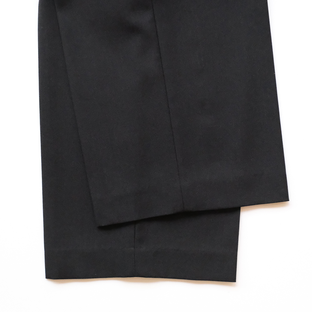こちらは上質な極細繊維のスーパー140’sウールを使用し、限界まで高密度に織り上げたウールギャバジン素材のスラックスになります。仕上げにウールの伸縮性を活かしてハリコシを最も強く出す加工と撥水加工を施し、シワになりにくく、独特なハリ・コシと落ち感、程良い光沢が魅力の一本です。