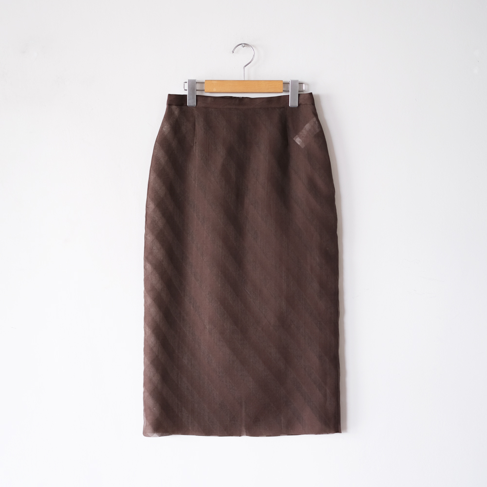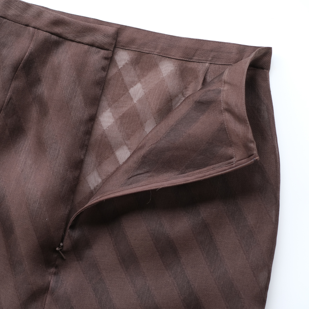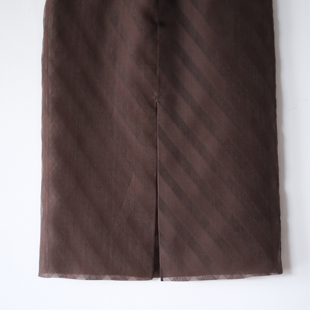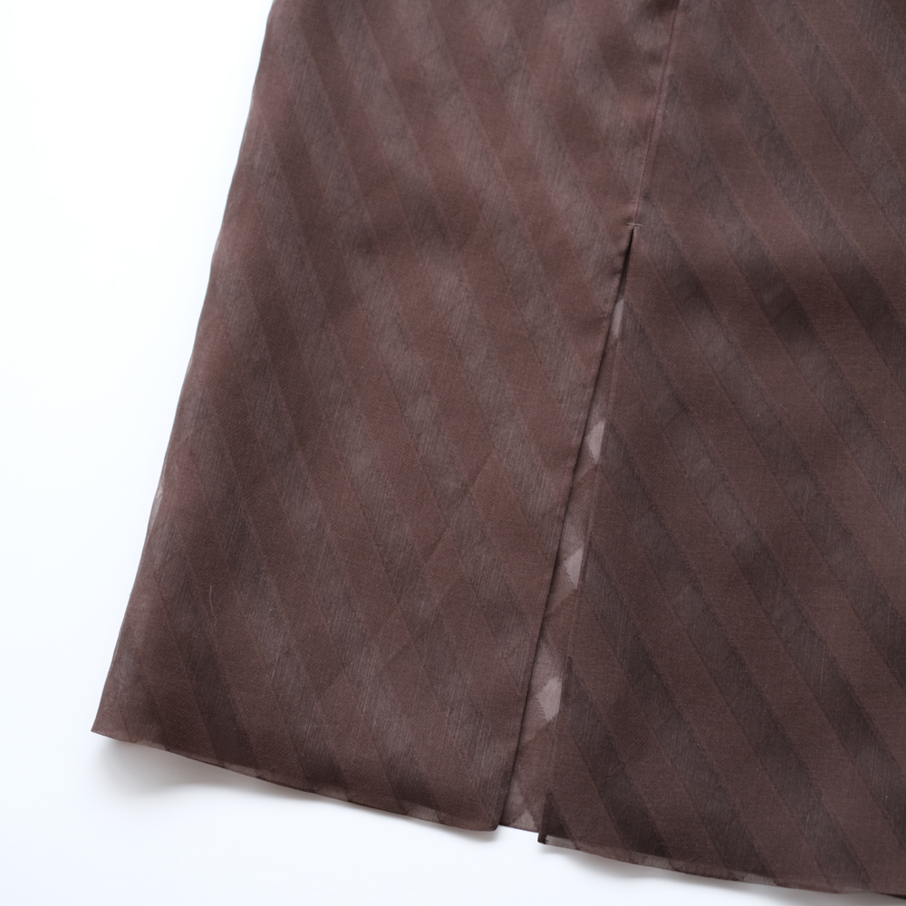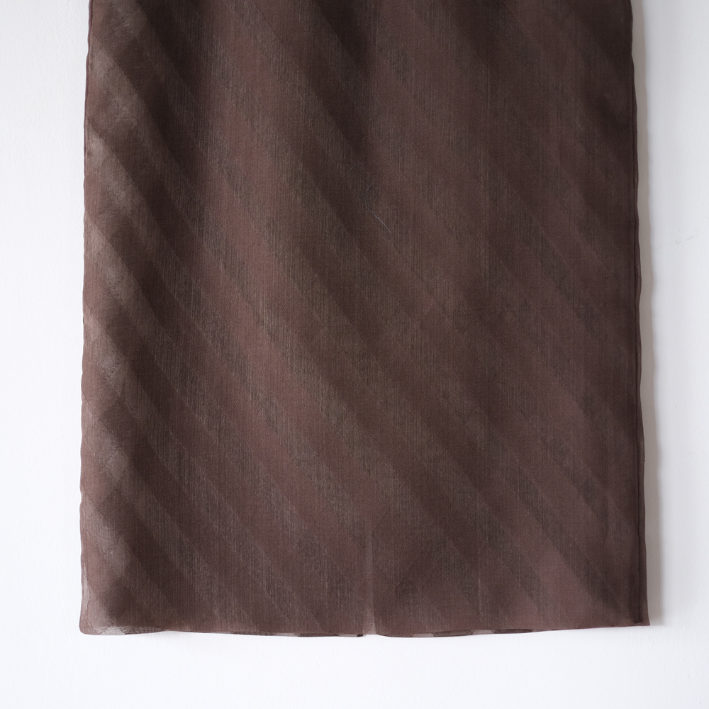 こちらはタテ糸・ヨコ糸共にシルクオーガンジーの糸を使用し、シャリ感のある風合いに仕上げたスカートになります。生地の一部をカットする事でグラウンド部分に透け感を生み出しており、透き通るようなクリアな見た目と繊細な表情が魅力の素材です。