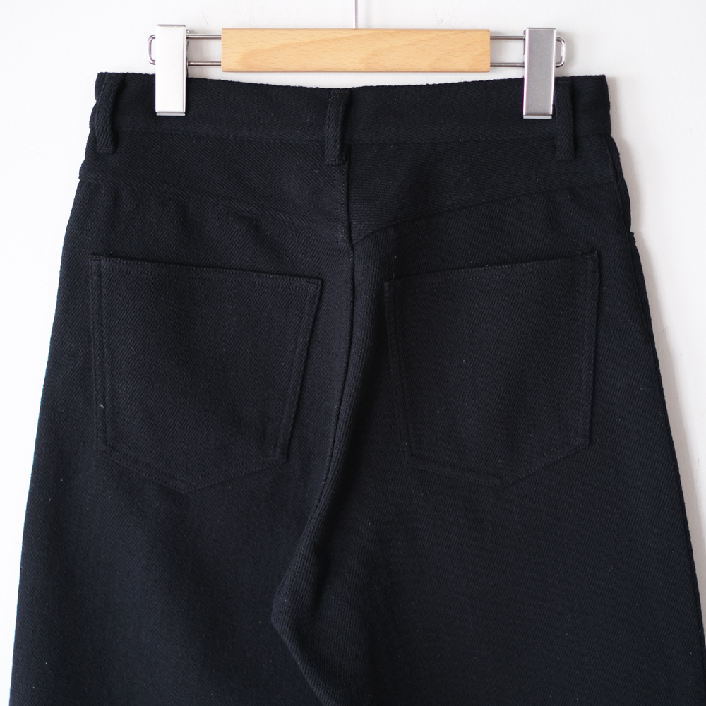こちらは太番手のシルクノイル糸を強撚し、デニム地に織り込んだユニークな素材となっております。シルクノイルならではの豊かな光沢と、強撚糸による独特な弾力とふくらみに加え、滑らかで美しい落ち感も兼ね備えた一着となります。