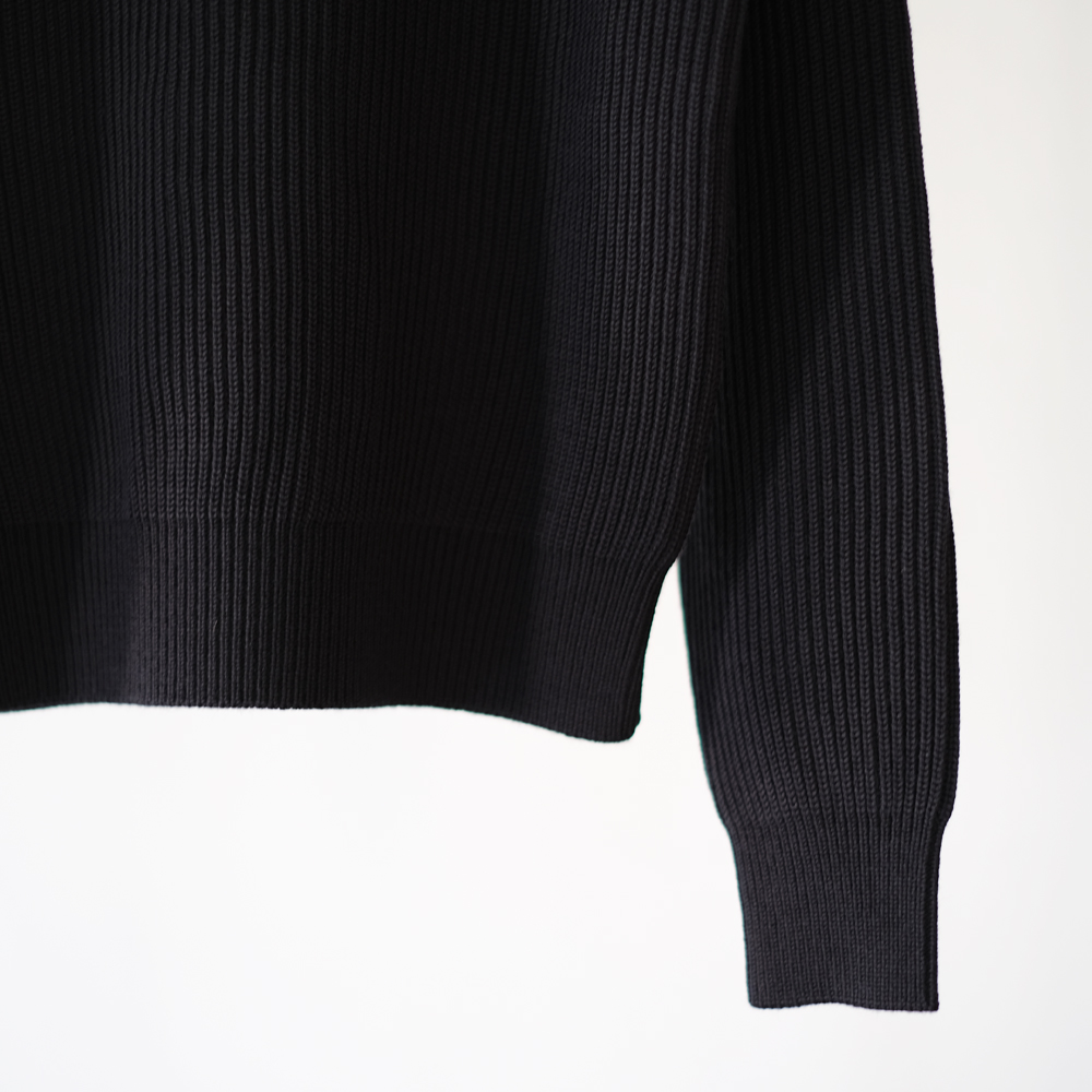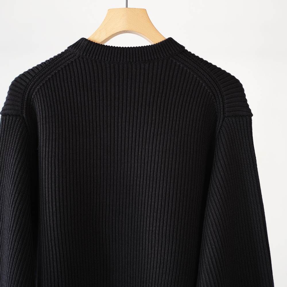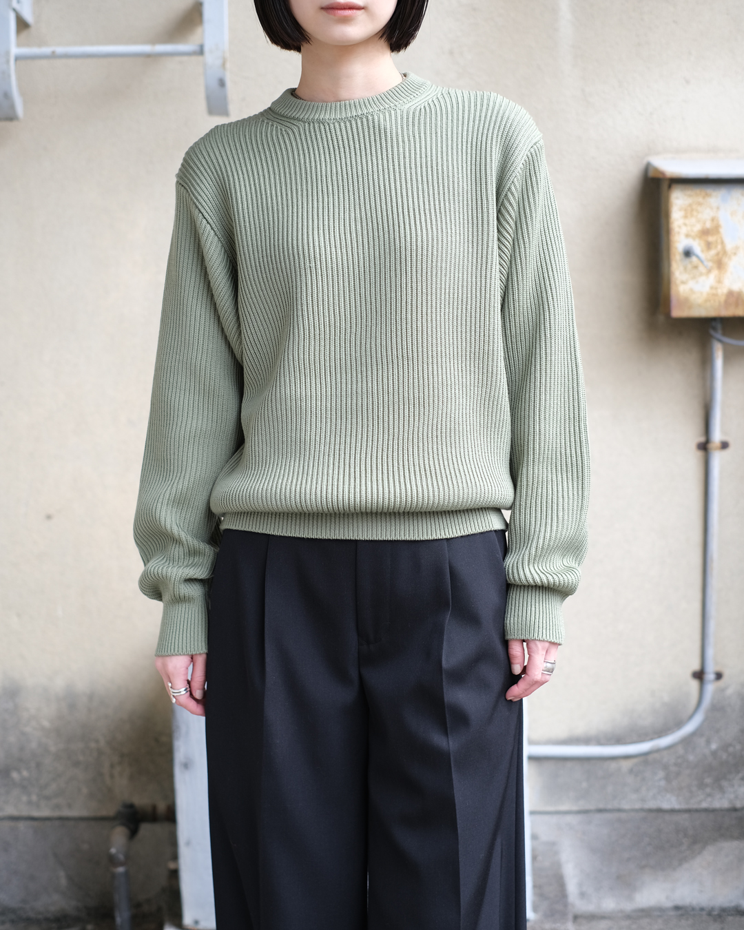 こちらはオーストラリア産の繊細なメリノウール原料を使用し、防縮加工を施した糸で編み立てた畦ニットになります。高品質なウール原料ならではの柔らかさと膨らみに加え、迫力のある弾力感が特徴の素材です。