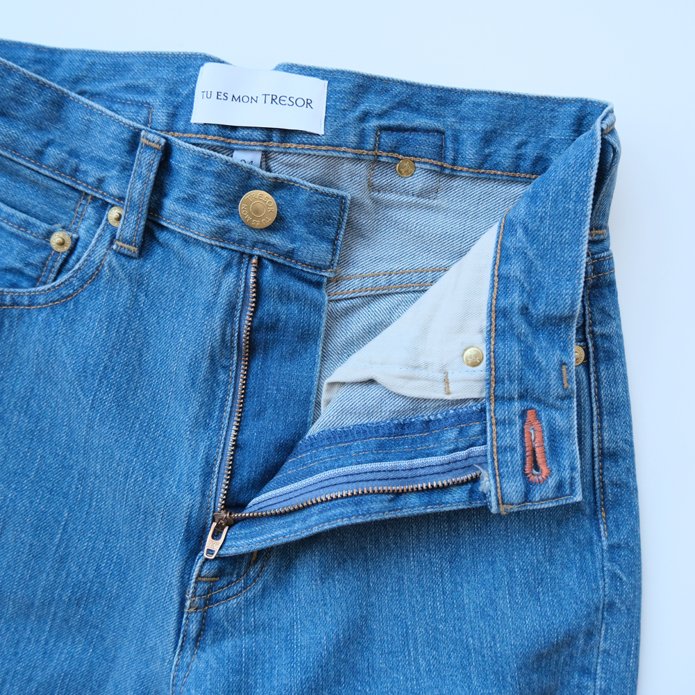 <Tu es mon Tresor>はデザイナー佐原愛美氏より「女性のためのセーフプレイスを作りたい。女性の視点を通して、女性の体型や感性に寄り添ったデニムを提案する」という考えから生まれたクリエイティブデニムブランドです。定番として永く穿き続けられるクラシックなシルエットを軸に、穿く人を選ばない多様な体型にフィットするデニムは、トレンドに左右されることなく永くワードローブの主役として活躍してくれます。