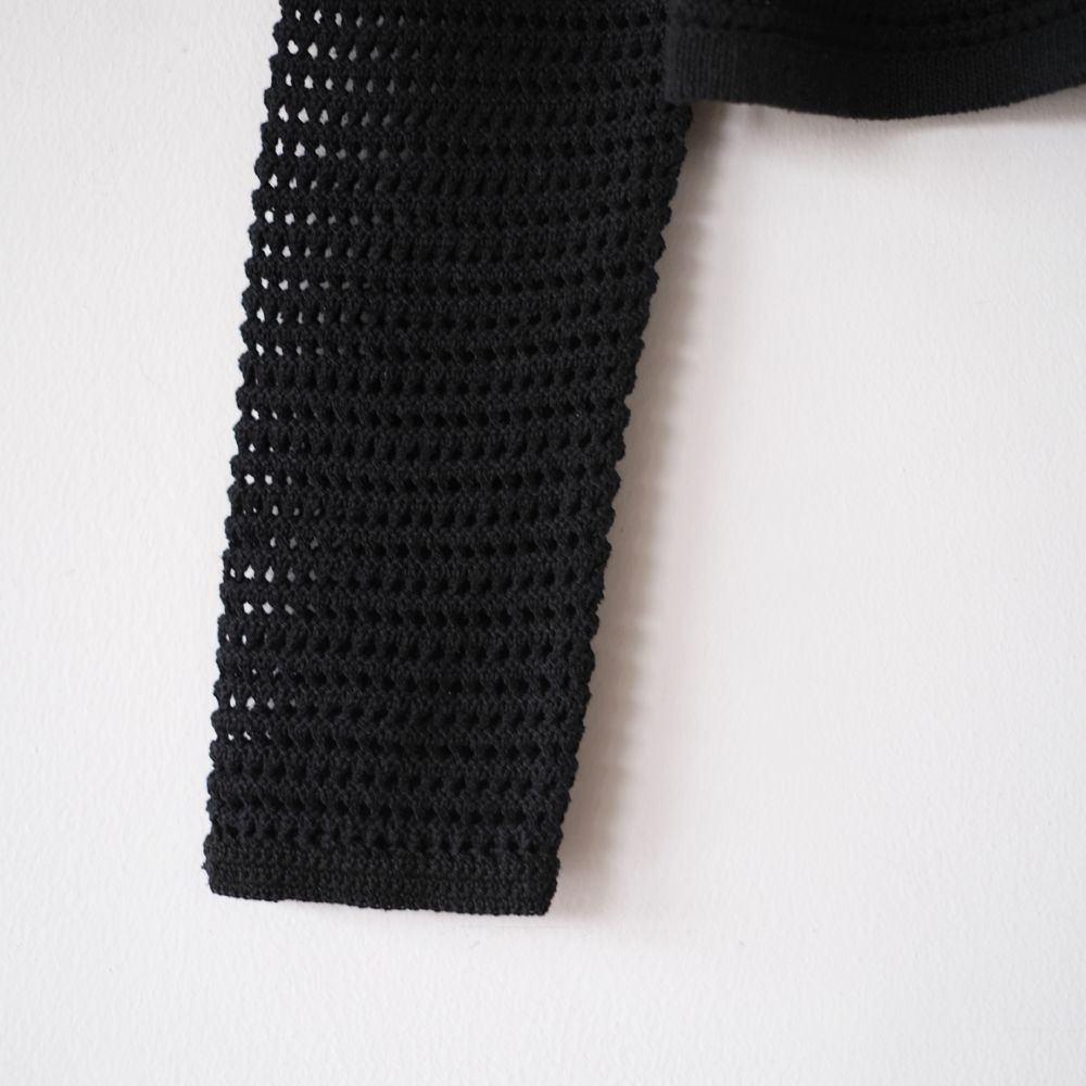 こちらはスビンコットン原綿にスビンコットンの落ち綿を混ぜて紡いだノイル糸に、シルクの紬糸を撚り合わせた特別な糸を使用しています。その糸をかぎ針編みのようなメッシュ組織で編み上げた、繊細で表情豊かな風合いが魅力のニットです。