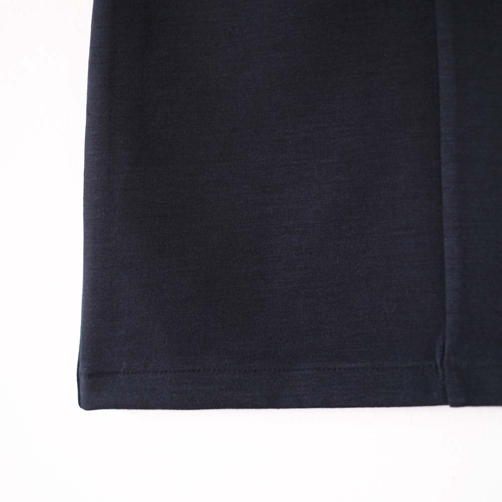こちらは16.5μのウール原料を使用し、ナイロンを芯にした芯鞘構造で極細番手に紡績した糸を用いて、ハイゲージで編み立てたベアダンボール素材になります。上質な原料由来のソフトでさらりとした肌触りと、優れた伸縮性が特徴のテクニカルな素材感が魅力の一着です。