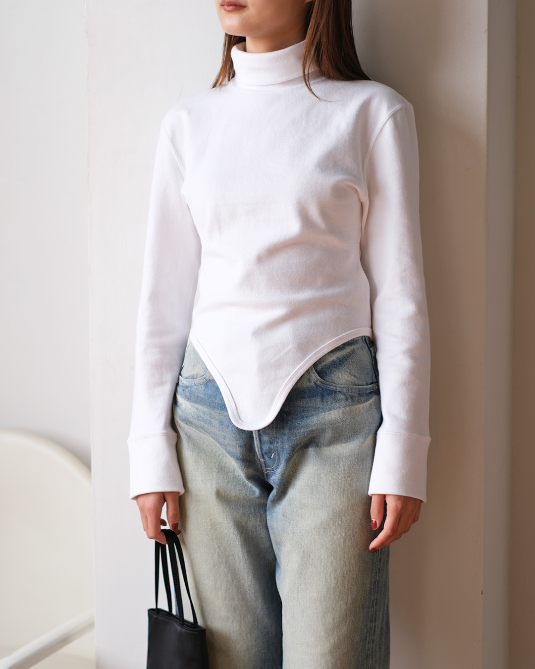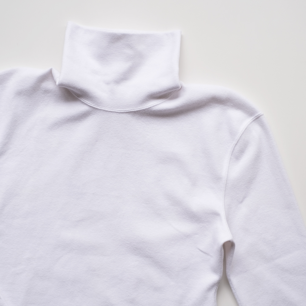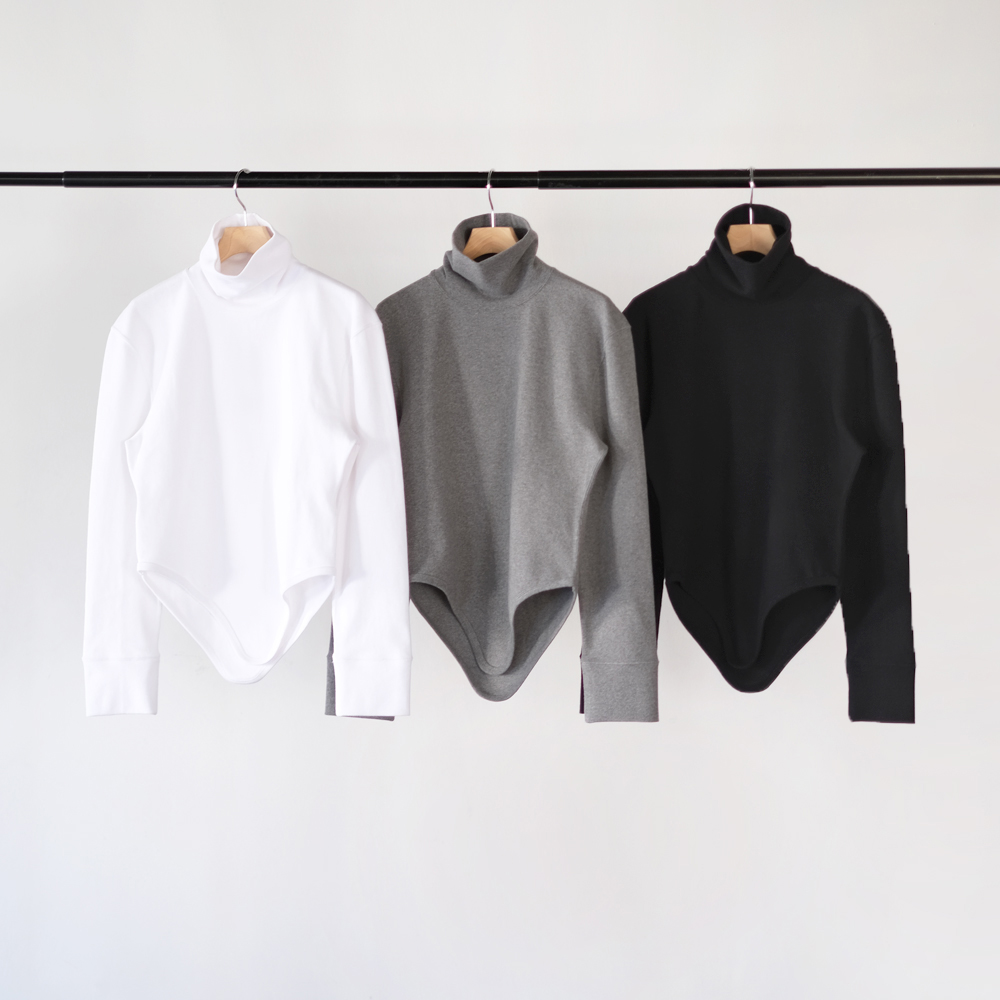 こちらは厚手ながら通年で着用可能なコットン素材を使用した一着で、肩まわりやボディラインには丸みを帯びた立体的なパターンを採用し、空気をはらんだような膨らみと豊かなシルエットを作っています。また、フロントからバックへ流れるようなテールラインがアクセントでシンプルな中に動きを与えます。首元は程よい高さで、折り返しても自然にたゆませても着られるデザインです。