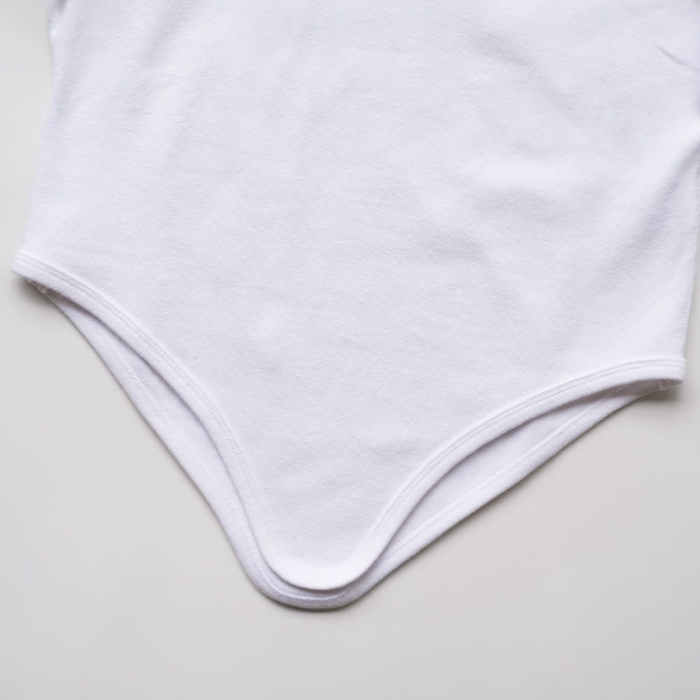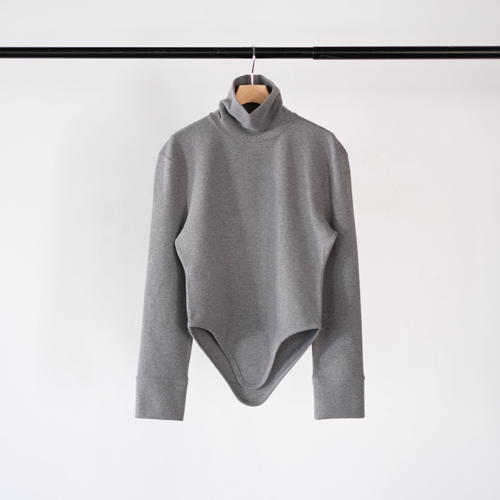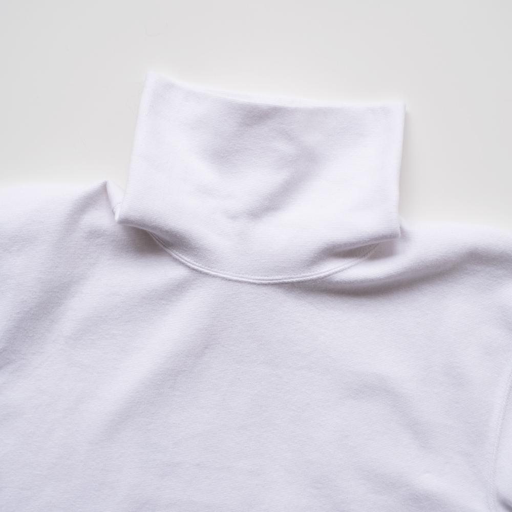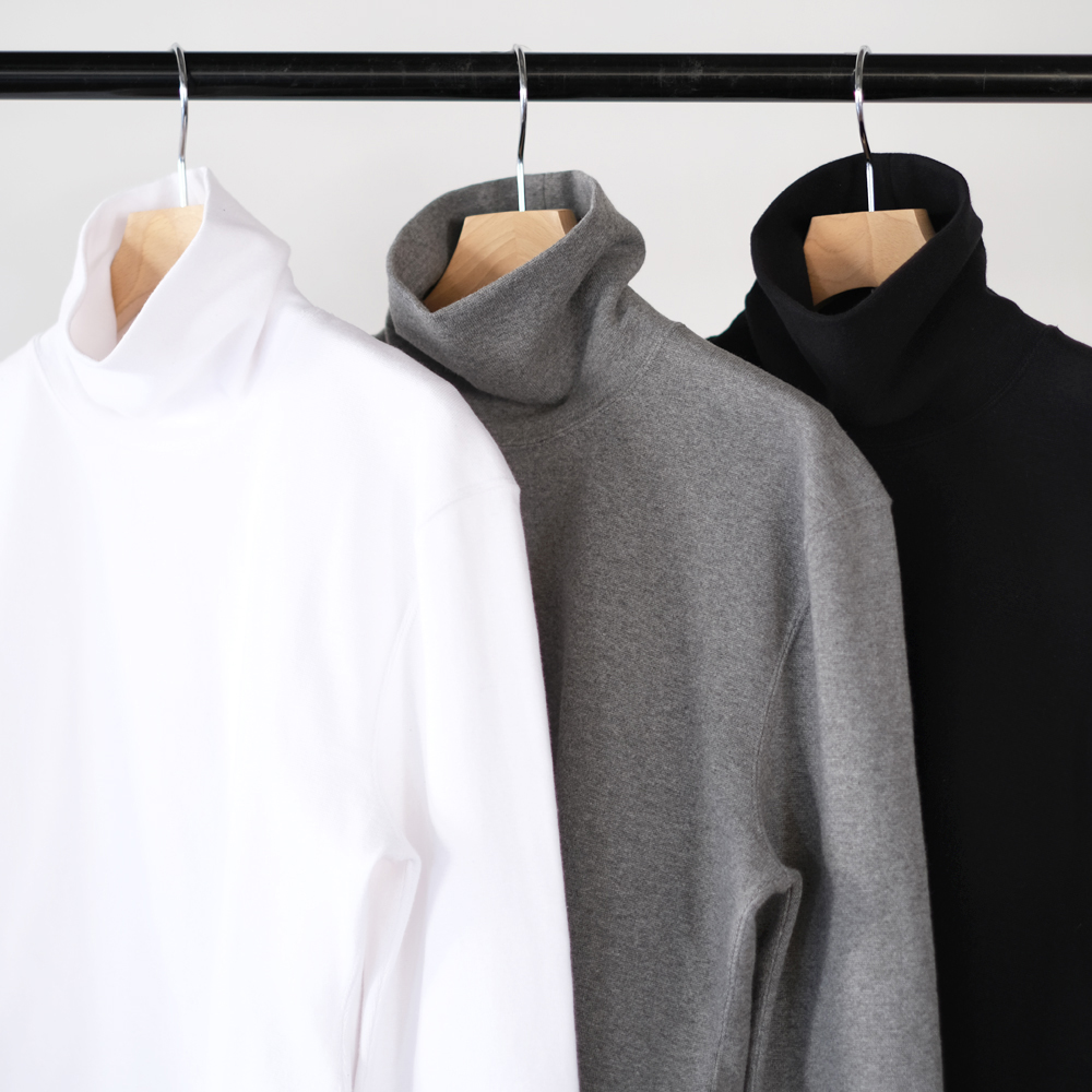 こちらは厚手ながら通年で着用可能なコットン素材を使用した一着で、肩まわりやボディラインには丸みを帯びた立体的なパターンを採用し、空気をはらんだような膨らみと豊かなシルエットを作っています。また、フロントからバックへ流れるようなテールラインがアクセントでシンプルな中に動きを与えます。首元は程よい高さで、折り返しても自然にたゆませても着られるデザインです。